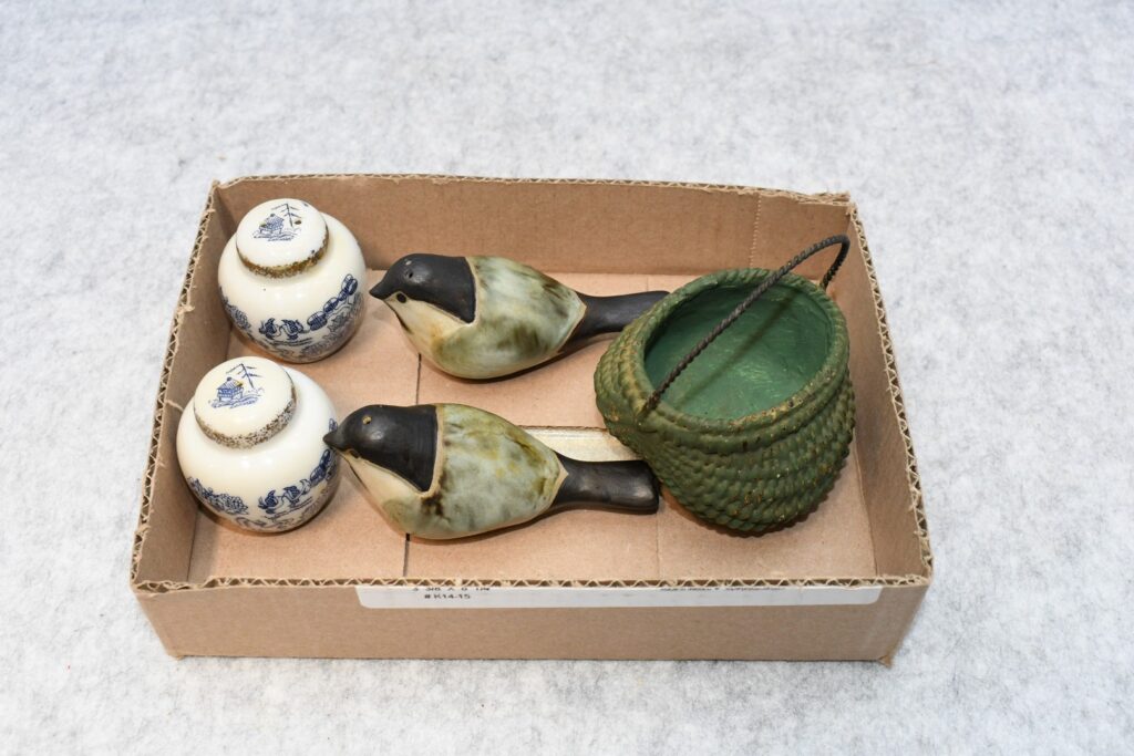 Antiques and Collectibles: Large Amount of Pottery Crocks and Jugs, Pottery Bowls, Pottery Planters, Pottery Molds, Pottery/Ceramic Figures, Signed Pottery Plates, McCoy Pottery, Williamsburg Pottery, Granite and Porcelainware, Pair of 19th Century Meissen Porcelain Salt and Pepper Figurines, Bank Notes and Currency, Black Americana Items, Large Carved Wooden Swan Decoy on Stand, Carved Wooden Duck Decoys, Railroad Buttons, Advertising Pinback Buttons, (8) Lots of Marbles Including Uranium Glass Marbles, (16) Various Lots of Vintage Poker Chips, Vintage Lamps and Lanterns, (23) Lots of Various Wood Planes, Blacksmith Tools, Keystone Mince Meat Wooden Advertising Bucket, Woven Baskets, Wooden Buildings, Case “The Early Americans” Knife Display, Coffee Mills, Woodware, Tabacco Pipes in Display Case, Vintage Mills, Vintage Decorated Wooden Sled, Amelia Cate De La Tour Art Decco Lady w/3 Dogs on Onyx Base, Vintage Match Holders, Advertising Tins, Vintage Picnic Basket, Sterling Silver Plate, British Connaught Rangers Officers Helmet Tin, Brass Balance Scales that Measure in Pennyweight, Old Photographs, Old Books, Vintage Advertising Signs, Maryland Civil Defense Arm Band, Vintage Dolls, Very Rare Carved Beaver Butter Press, Vintage Childs Toys, Vintage Oilers, Powder Horns, Powder Flasks, World Globe Pencil Sharpener, Cookie Cutters, German WWI Medical Canteen w/Original Corduroy Cover, Leather Harness, and Steel Cup, Nelke Box Dolls, Gas Pens, (11) Various Axes and Hatchets, (20) Various Carved Wooden Canes and Night Sticks, Various Knives, Framed and Unframed Prints and Pictures, and Other
