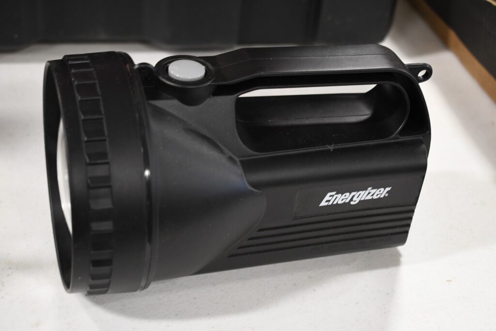 Tools: Spotlight, Drills, Drill Bits, Craftsman Stackable Boxes, DeWalt Batteries, DeWalt Saw, 3-Gallon Air Compressor, Hoses, Screw Drivers, Bungy Cords, Tool Sets, Portable Power Pack, Sockets, Propane Torch, Pliers, Wrenches, Saw Blades, Clamps, and Other