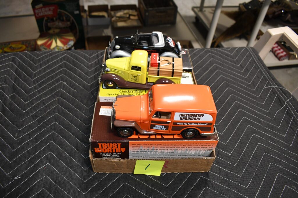 Collectible Toys and Trains: Vintage Tin Toys, Cast Toys, Childs Toy Blocks, Toy Truck Banks, Diecast Toy Tractors, Toy Tractor Trailers, Lionel and Other Train Engines, Tenders, Cars, Layout Accessories, Track, and Other