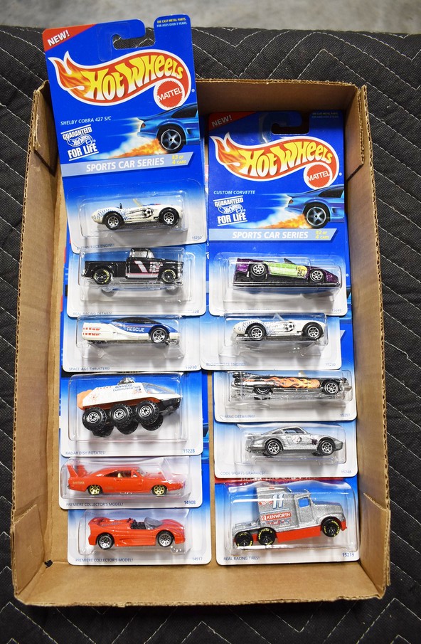 Collectible Toys and Trains: (15) Tray Lots of Hot Wheels, Matchbox NASCAR Cars, Diecast Toy Cars and Trucks, Toy Truck Banks, Golden Rule Lumber Center Truck Banks, Collectible Fire Engine Toys, Wet Works Action Figures, Star Wars Action Figures, Star Wars Games, Lord of the Rings Action Figures, Toy Tractor Trailers, Winross Trucks, Miniature Hit Miss Engines, Vintage Tin Toys, and Other