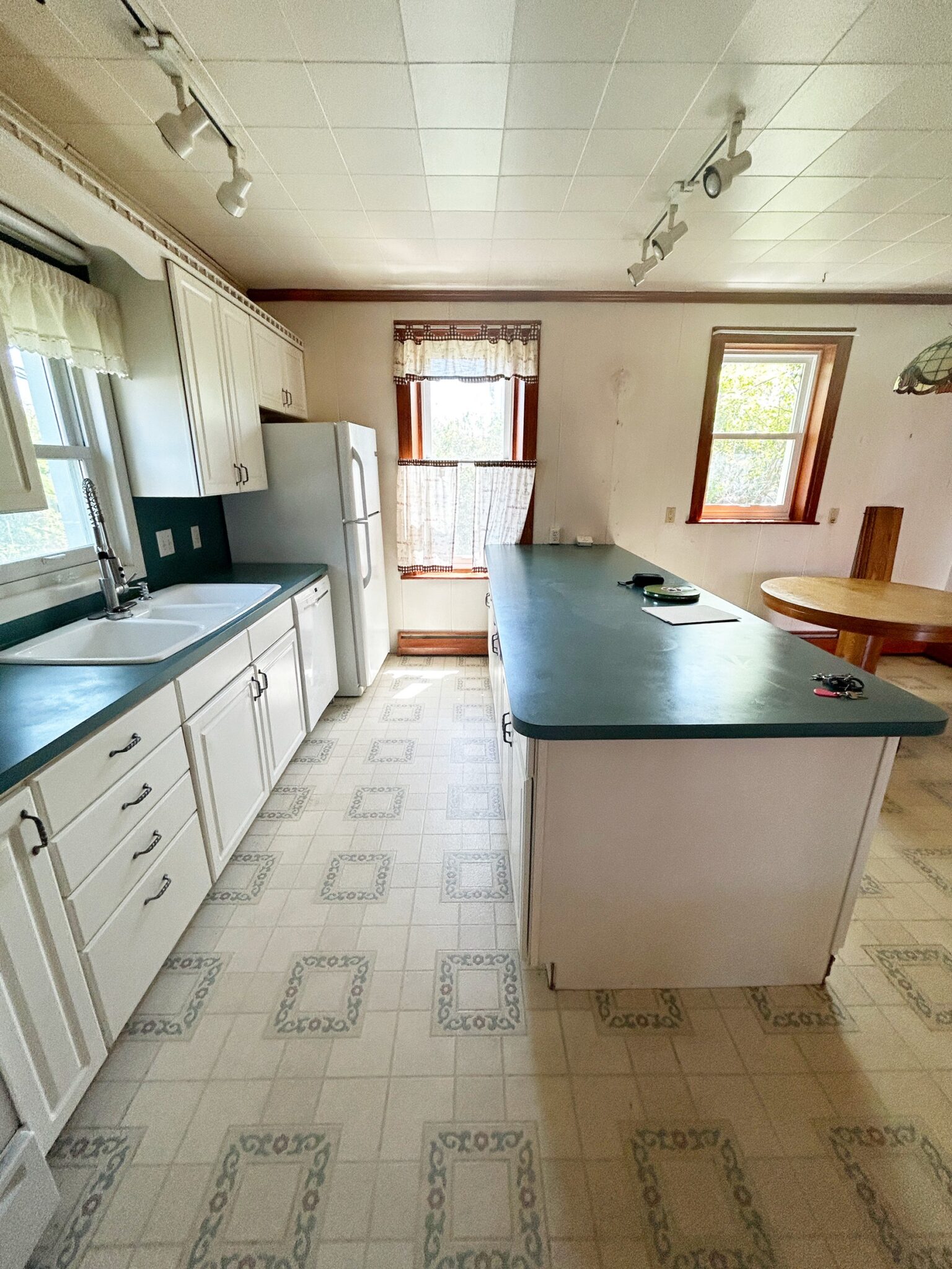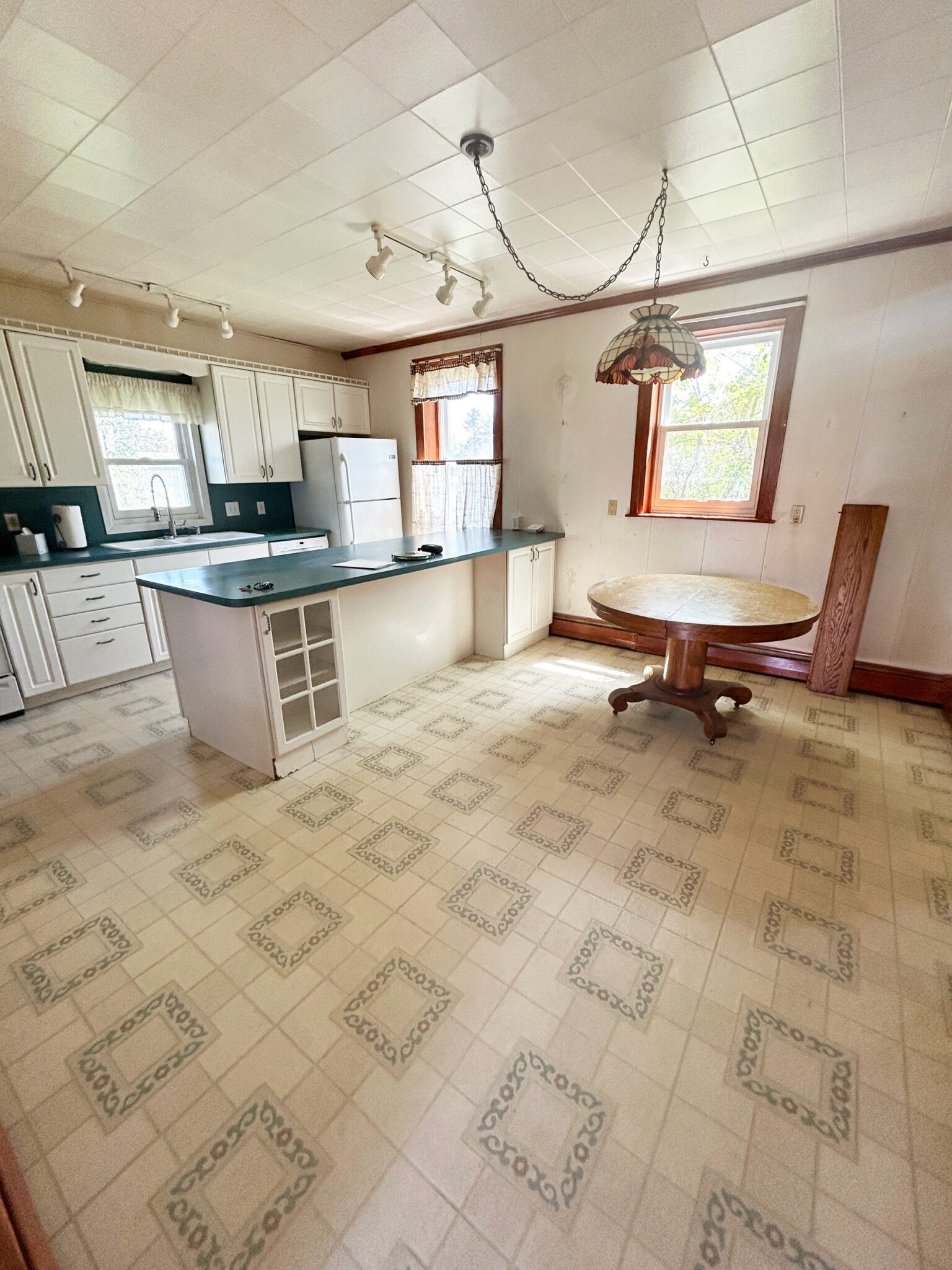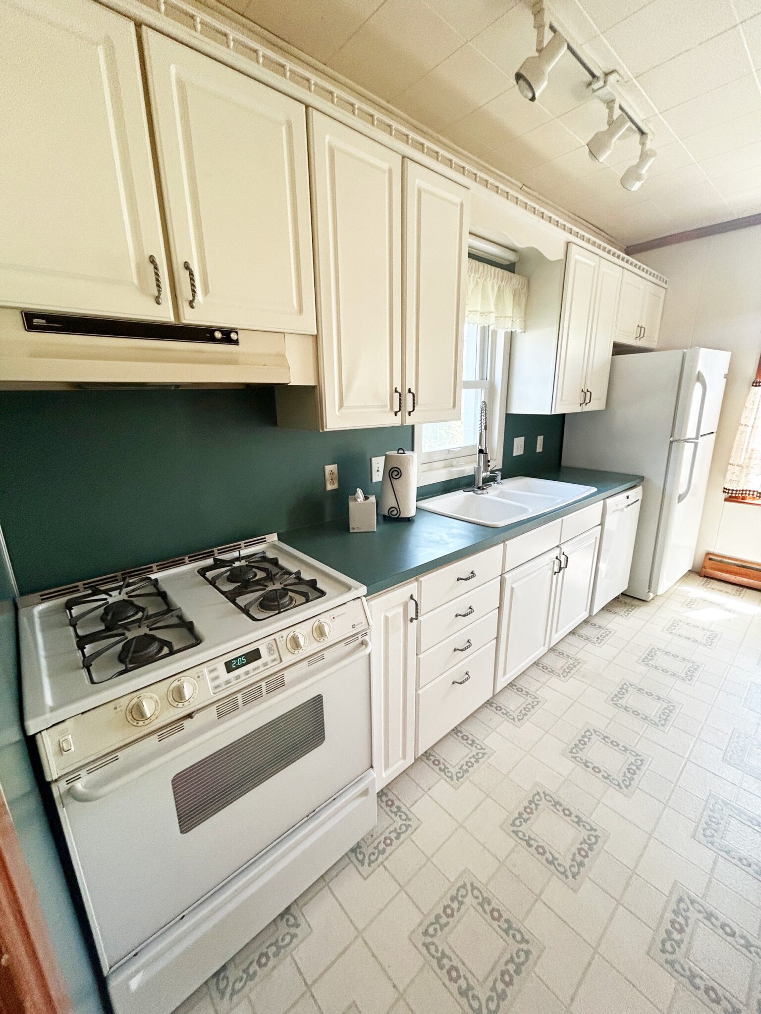 - Eat in Kitchen: 18’x14’ – Vinyl Flooring, White Wood Cabinets, Laminate Counter Tops, Frigidaire Fridge, Maytag Gas Stove, and Bosch Dishwasher, Access to Half Bath and Side Entrance Door