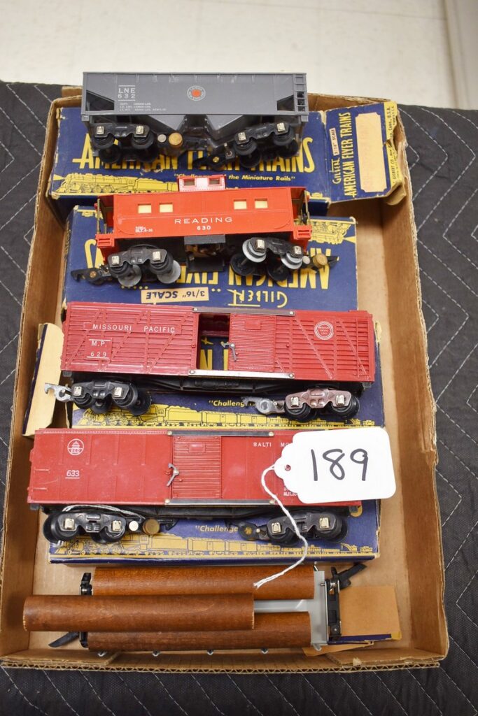 189.        Lot of 5 American Flyer Train Cars – Including Hopper Car 632, Reading 630, Missouri Pacific 629, Baltimore &...