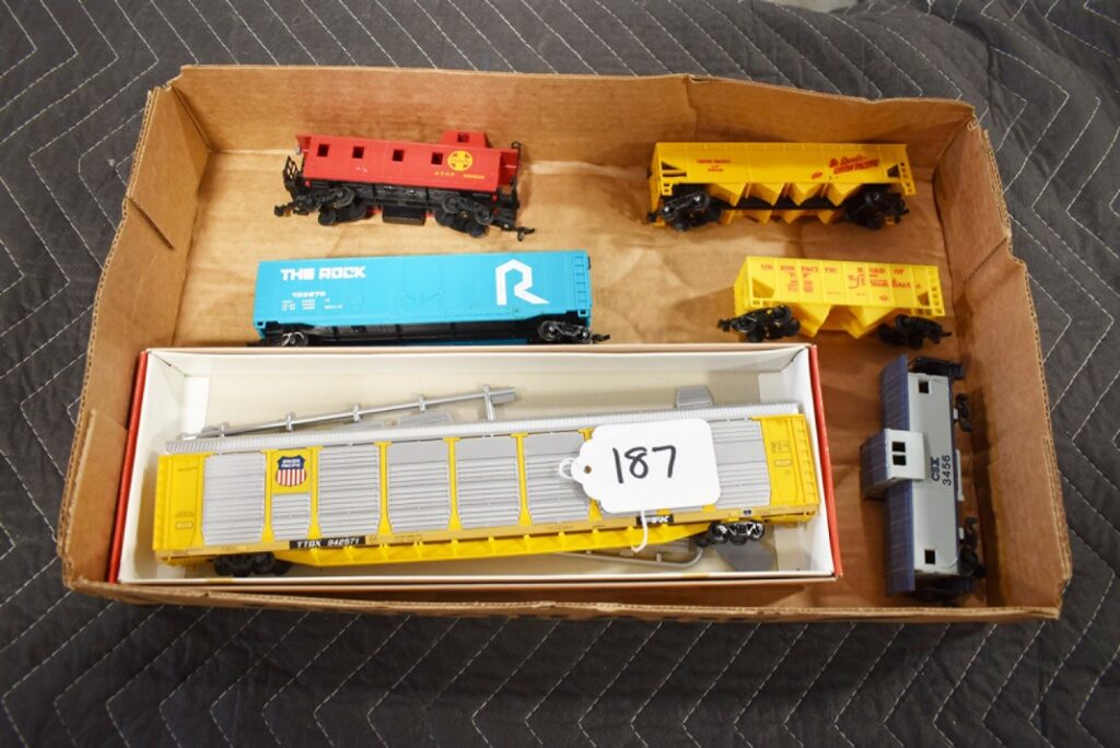 187.        Lot of 6 HO Scale cars – Including TTGX 942571, CSX 3456, Union Pacific 32100, Union Pacific 518125, Santa...