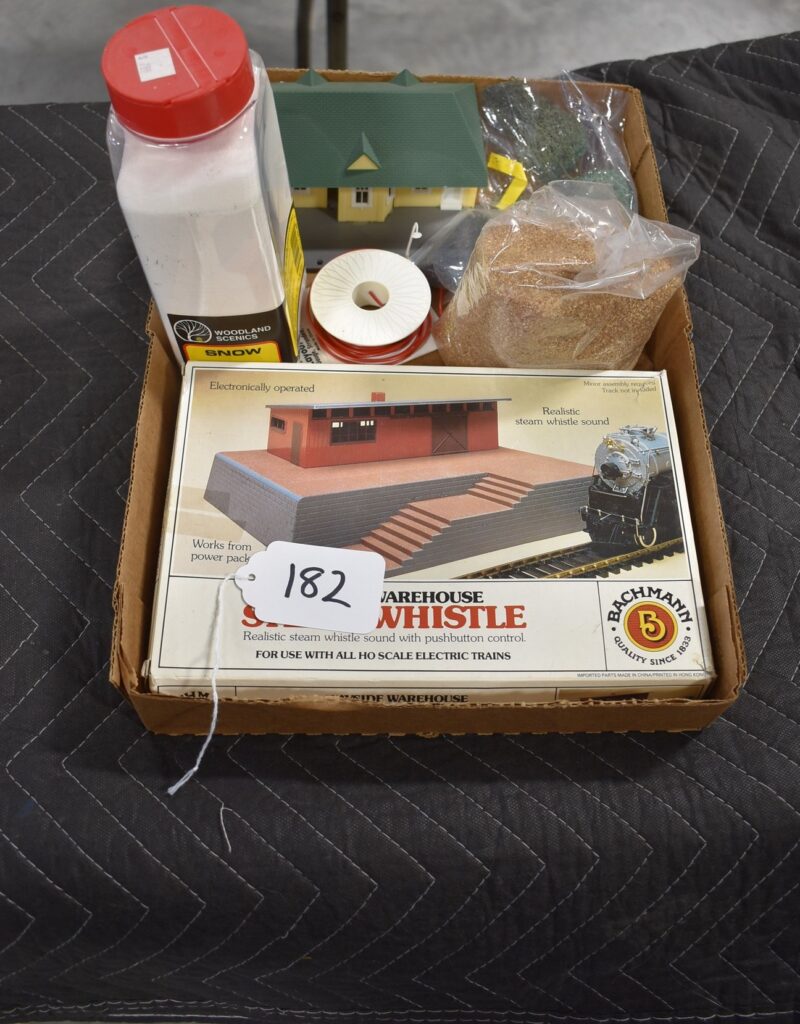 182.        Lot Including Bachmann Wayside Warehouse w/Steam Whistle Sound, Sand, Snow, Dirt, and Other Scenery & Misc. Plastic Building