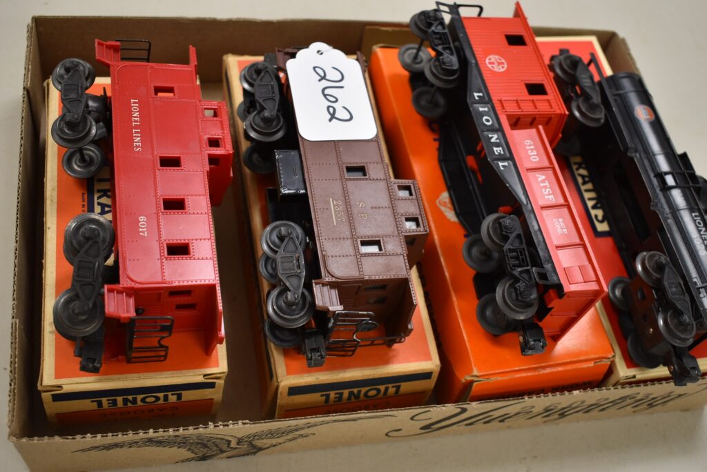 262.        Lot of 4 Lionel Train Cars – Including Caboose No.6017, Caboose No. 6257, Work Caboose No. 6130, and Tank...