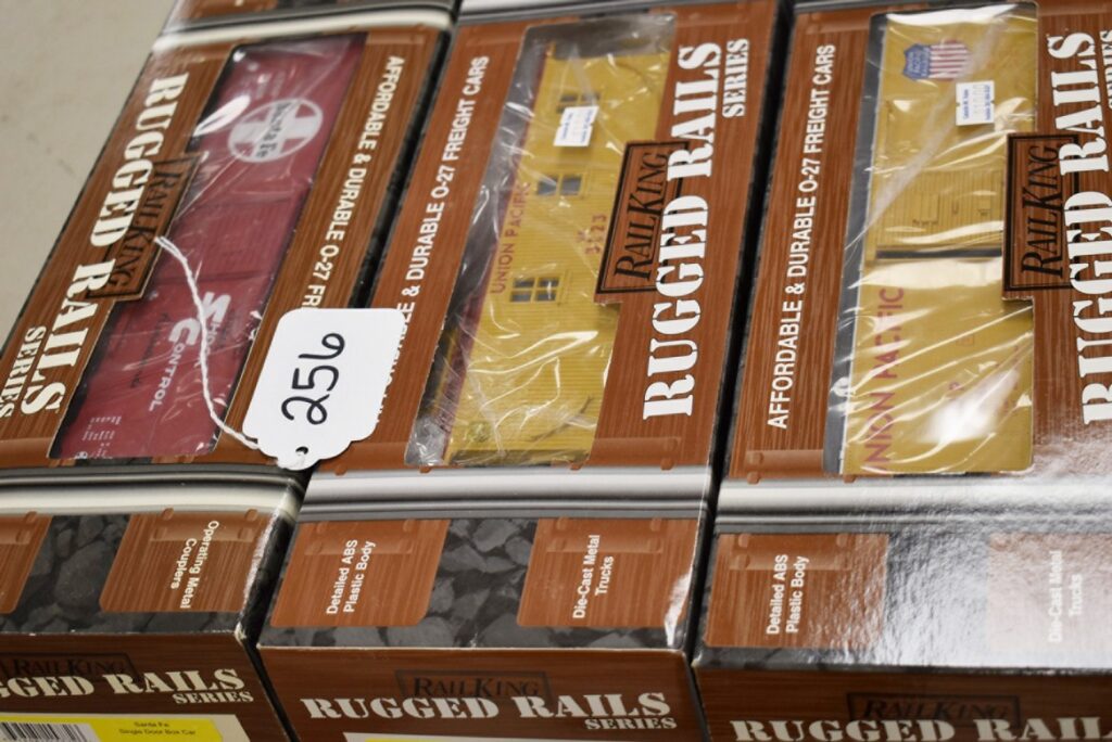 256.        Lot of 3 Rail King Rugged Rails Series Train Cars – Including Santa Fe Single Door Box Car 33-7404,...