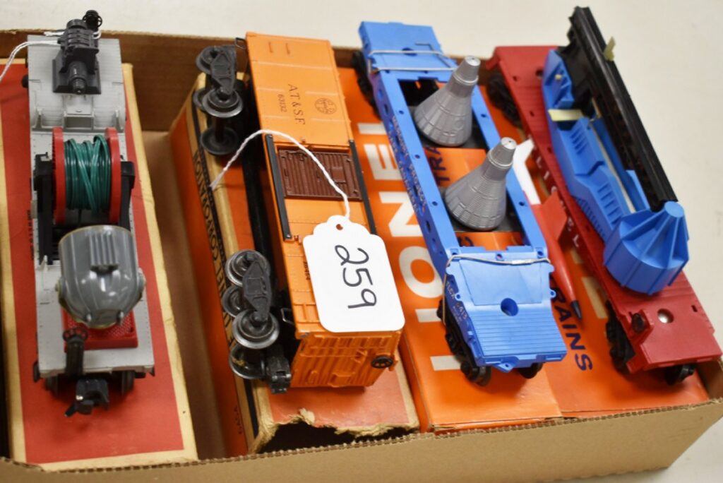 259.        Lot of 4 Lionel Train Cars – Including Searchlight Extension Car No. 3650, Santa Fe A.T. & S.F 63132,...