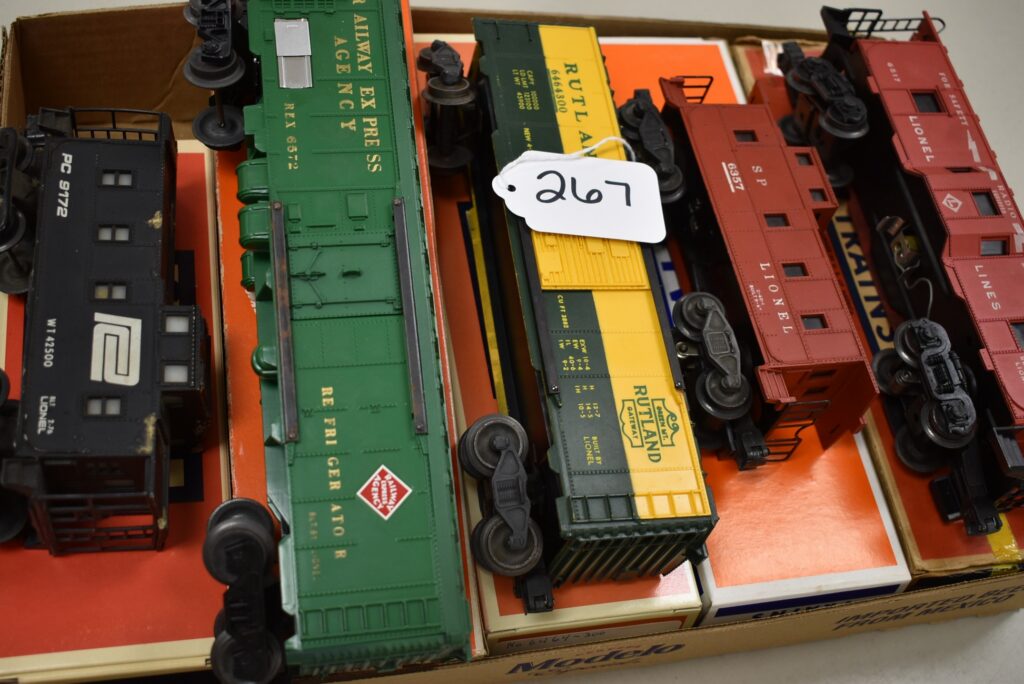 267.        Lot of 5 Lionel Train Cars – Including PC Caboose 9172, Refrigerator Car REX6572, Rutland 6464300, Caboose 6357, and...