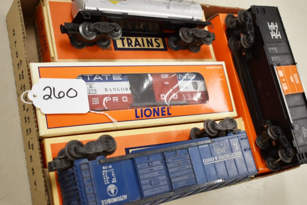 260.        Lot of 4 Lionel Train Cars – Including Tank Car 6465, Bangor and Aroostook State of Maine Boxcar 6-19285,...