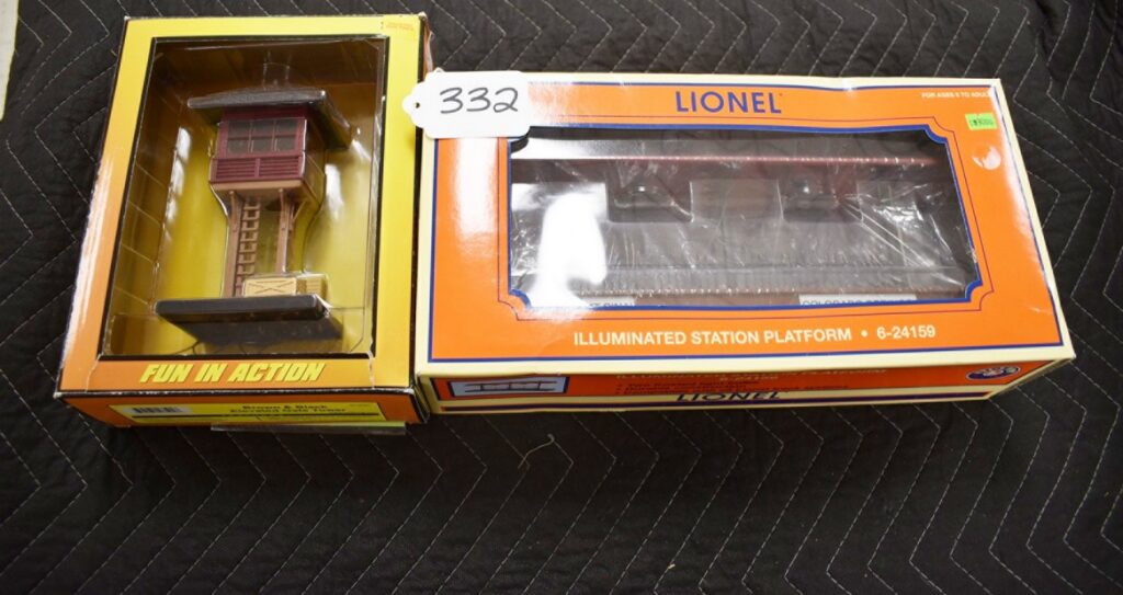 332.        Pair of Train Accessories – Including Rail King Brown and Black Elevated Gate Tower 30-9097 and Lionel Illuminated Station...
