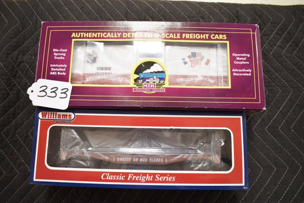 333.        Pair of Train Cars – Including Williams by Bachmann 40” Western MDF Flat Car w/Bullheads 47508 and M.T.H New...