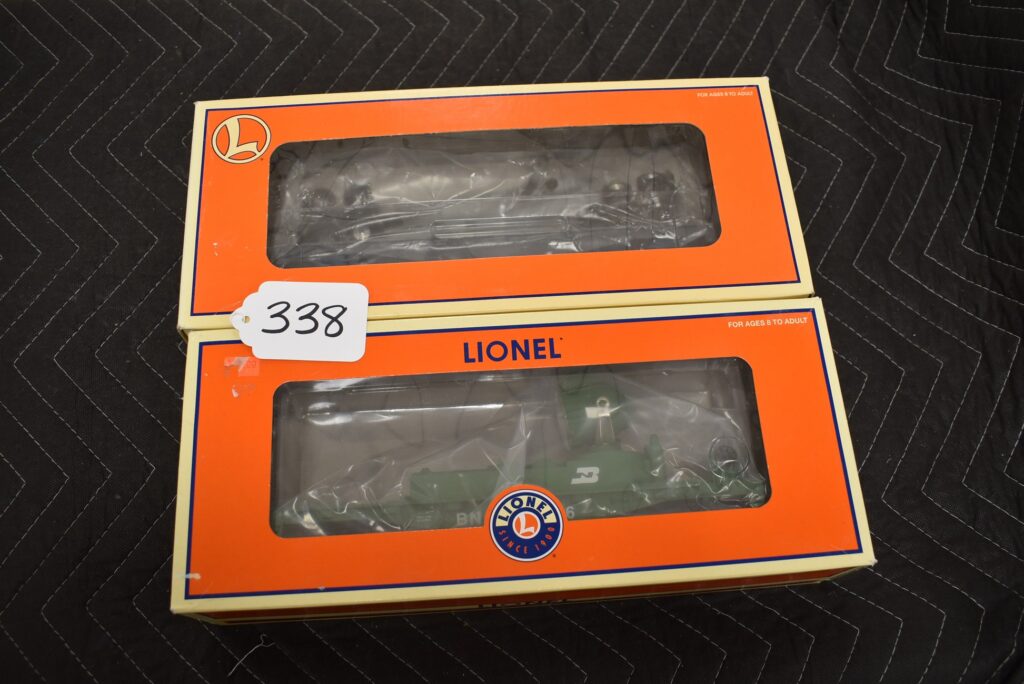 338.        Pair of Lionel O-Guage Train Cars – Including Burlington Northern Searchlight Car 6-26866 and Flat Car w/Trailer Frames 6-19474...