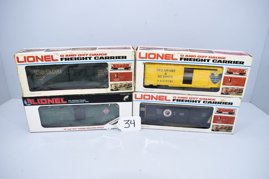34.          Lot of 4 Lionel O-Gauge Box Cars – Including Delaware & Hudson Box Car 6-9781, Susquehanna Box Car 6-9402,...