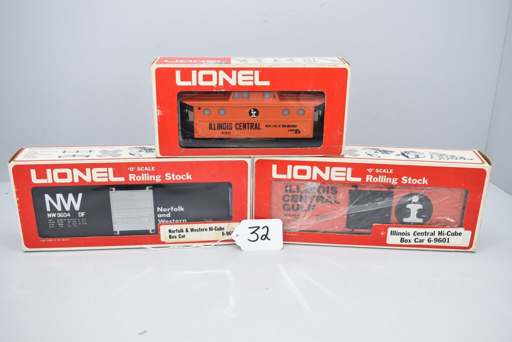 32.          Lot of 3 Lionel O-Gauge Train Cars – Including Illinois Central Caboose 9160, Illinois Central Hi-Cube Box Car 6-9601,...