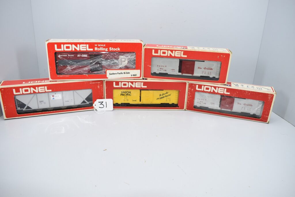 31.          Lot of 5 Lionel O-Gauge Train Cars – Including (2) D&RGW Box Cars 6-9714, Union Pacific Box Car 6-9717,...
