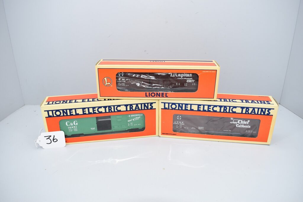 36.          Lot of 3 Lionel O-Gauge Box Cars – Including 646-497 ATSF Box Car 6-29202, T.T.O.S. Division Box Car 6-52058,...