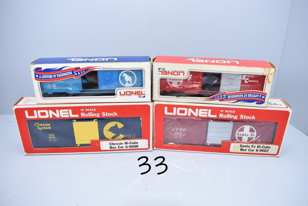 33.          Lot of 4 Lionel O-Gauge Box Cars – Including Box Car 9230, Box Car S.F. 9202, Santa Fe Hi-...