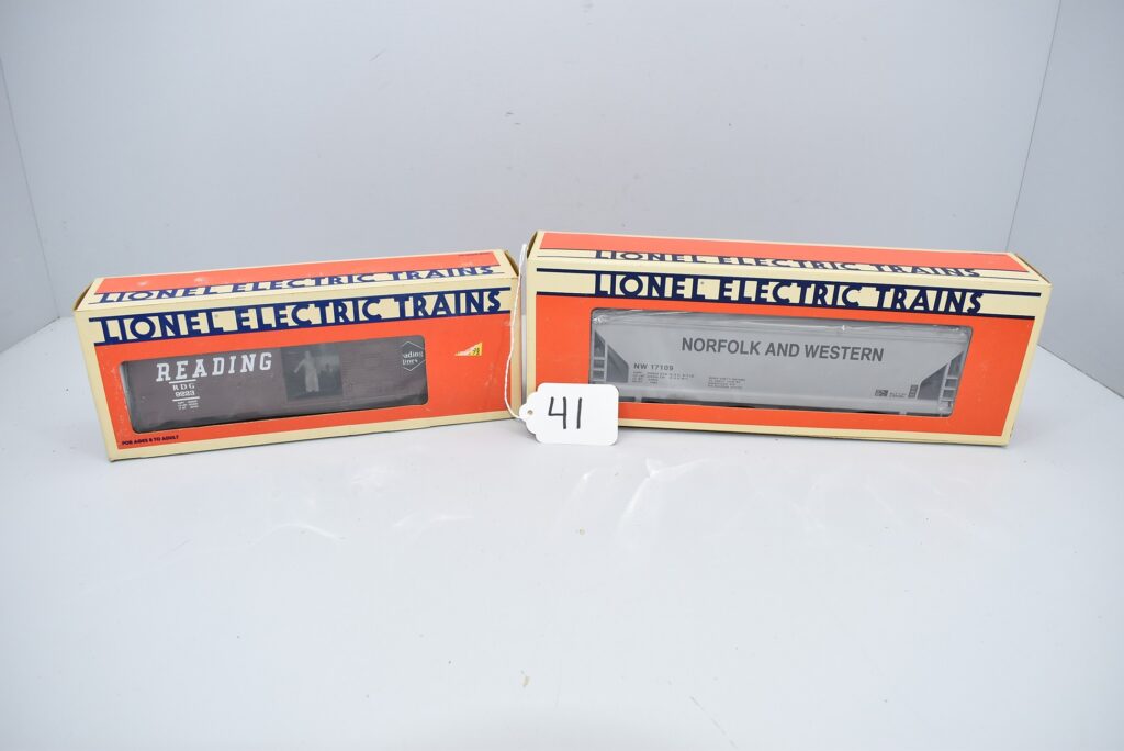 41.          Pair of Lionel O-Gauge Box Cars – Including Reading Operating Box Car 6-9223 and Norfolk and Western Centerflow Hopper...