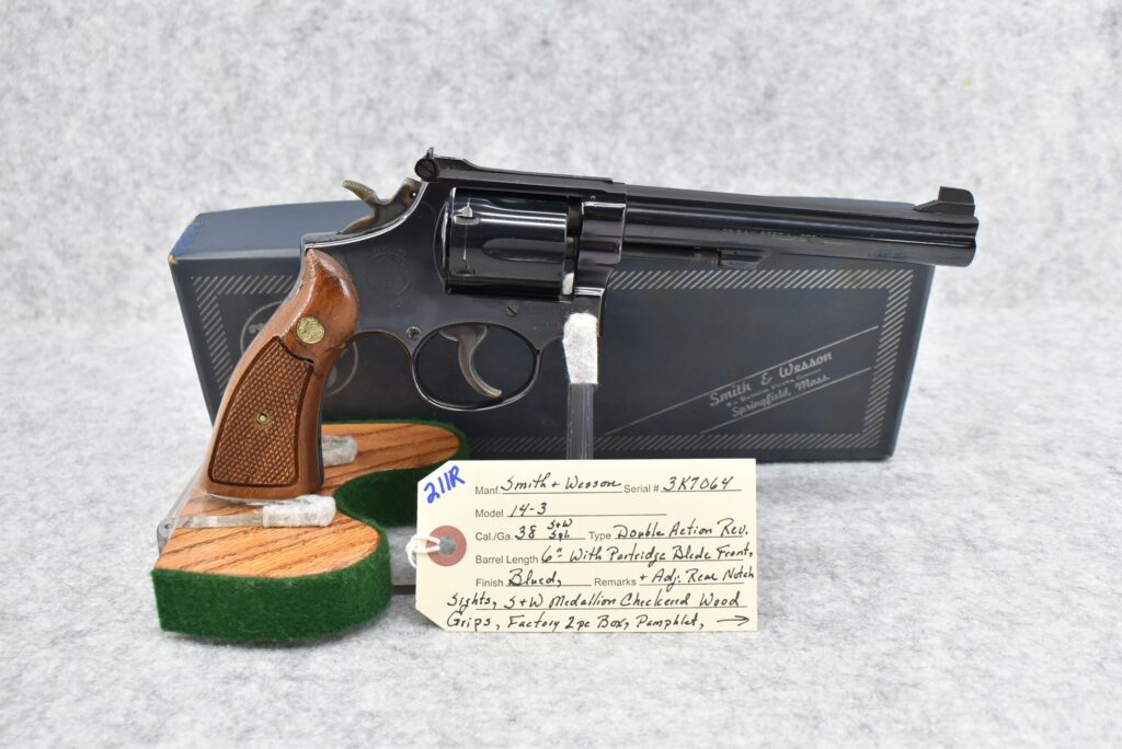 211R. Smith & Wesson – Mod. 14-3 – 38 S&W Spl. Cal. Double Action Revolver – w/6” Barrel w/Partridge Blade...