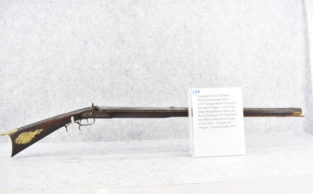 154.        Unsigned 32 Cal. Full Stock Percussion Kentucky Rifle – w/35” Octagon Barrel w/Front & Rear Barrel Sights – w/Full...