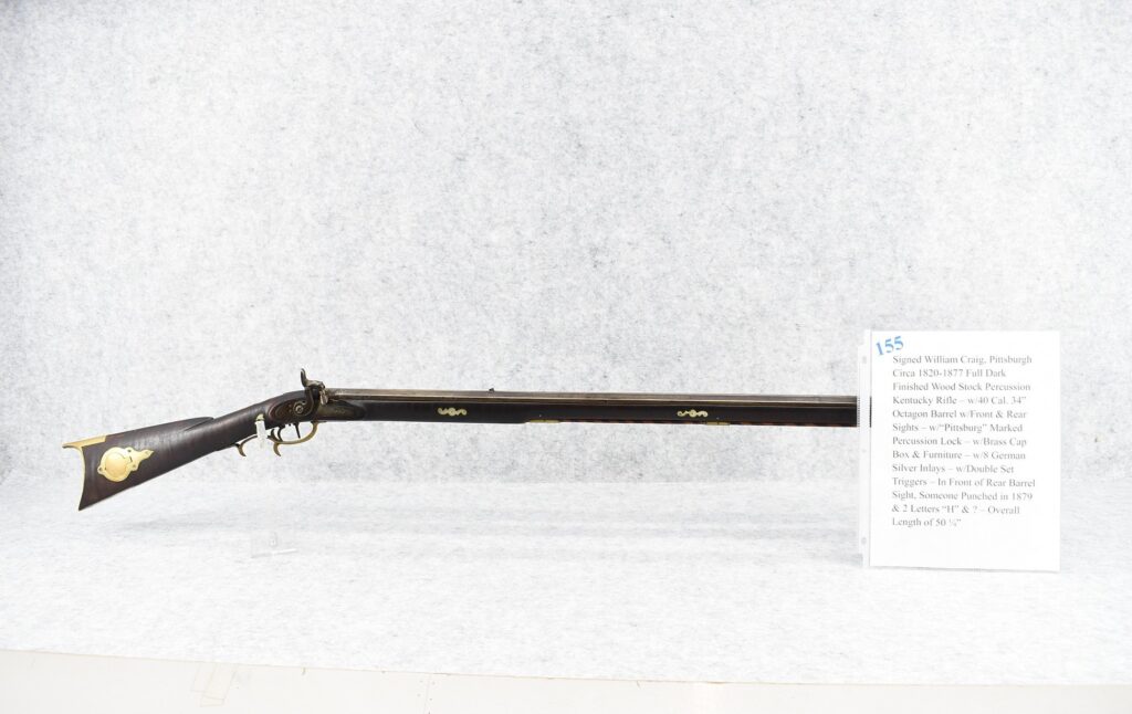 155.        Signed William Craig, Pittsburgh Circa 1820-1877 Full Dark Finished Wood Stock Percussion Kentucky Rifle – w/40 Cal. 34” Octagon Barrel
