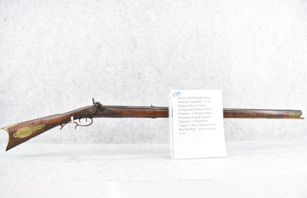 159.        44 Cal. Full Stock Percussion Kentucky Long Rifle – w/35” Octagon Barrel w/Sights – w/Engraved Cap Box & Brass...