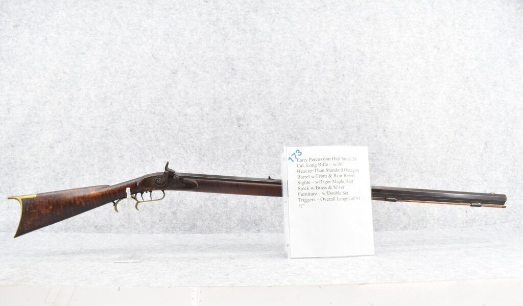 173.        Early Percussion Half Stock 36 Cal. Long Rifle – w/36” Heavier Than Standard Octagon Barrel w/Front & Rear Barrel...