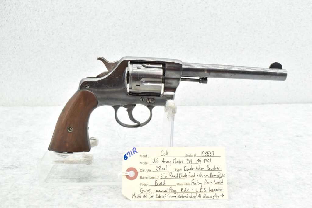 671R.     Colt – U.S. Army Model 1901 – 38 Cal. Double Action Revolver – w/6” Barrel w/Round Blade Front &...