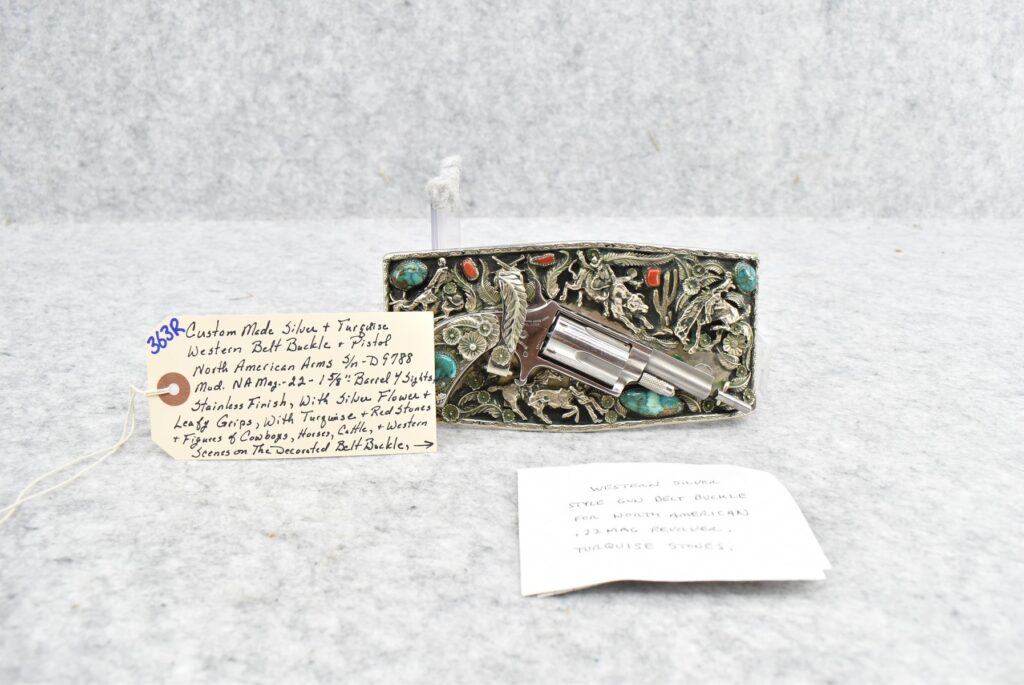 363R. Custom Made Silver & Turquoise Western Belt Buckle w/A North American Arms – Mod. NAA – 22 Win. Mag....