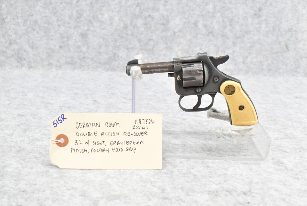 515R. German Rohm – 22 Cal. Double Action Revolver – w/3” Barrel w/Sight – Gray/Brown Finish – w/Factory Hard Grip...