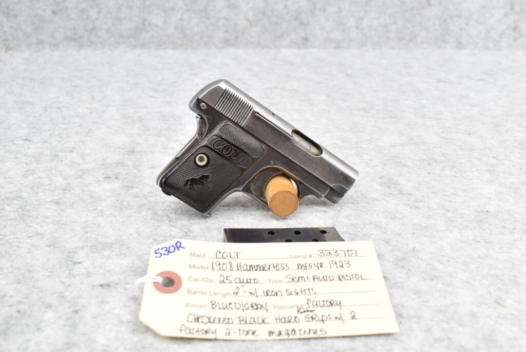 530R. Colt – Mod. 1908 Hammerless – 25 Auto Cal. Semi-Auto Pistol – w/2” Barrel w/Iron Sights – Blued Finish...