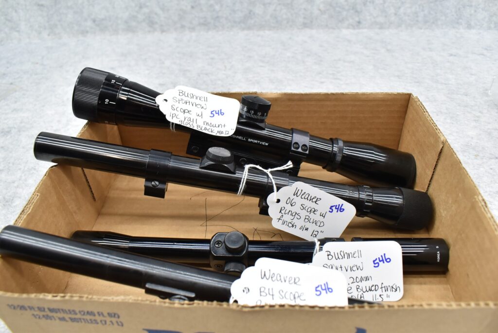 546. Lot of 4 Scopes – 1st is Weaver B4 – Blued Finish – 2nd is Bushnell Sportview 3x-7x .20mm...