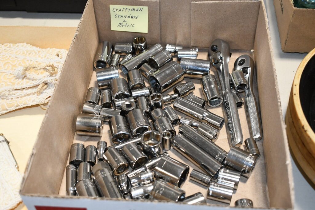 Antiques and Collectibles: (13) Carved Wooden Decoys, Pottery Crocks and Jugs, Longaberger Baskets, Railroad and Other Lanterns, Vintage Kitchenware Items, Glass Butter Churns, Wooden Butter Churns, Vintage Scales, Dolls, Vintage Postcards, Large Amount of Vintage Beaded Ladies Purses, Movie Posters, Vintage Cameras, Tabacco Pipes, Vintage License Plates, Boyds Bear Figures, Pinback Buttons, Advertising Items, Shore Birds, Marbles, Tools, Traps, Axes and Hatchets, Wall-Hanging and Mantle Clocks, and Other