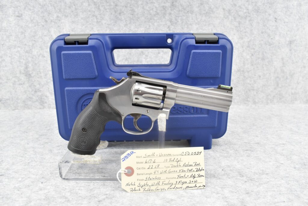 233R. Smith & Wesson – Mod. 617-6 – 22LR Cal. Double Action 10 Shot Revolver – w/4” Barrel w/Green Fiber...