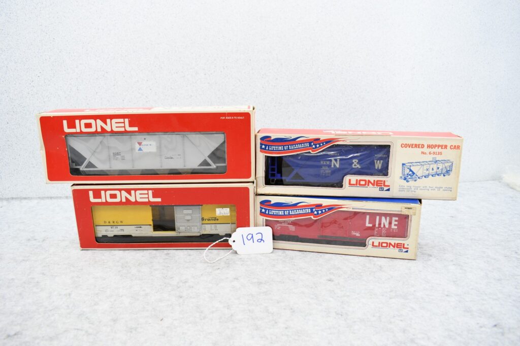 192.     Lot of 4 Lionel train cars including 6-9235 Covered hopper car, 9207 Soo Line boxcar, 6-9739 D/RGW boxcar and...