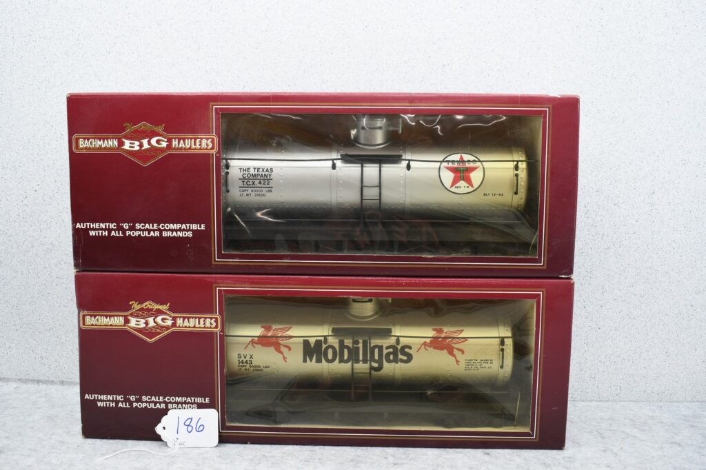 186.     Pair of Bachmann G Scale Big Haulers including Mobile Gas tanker and Texaco Tanker, both in original boxes.