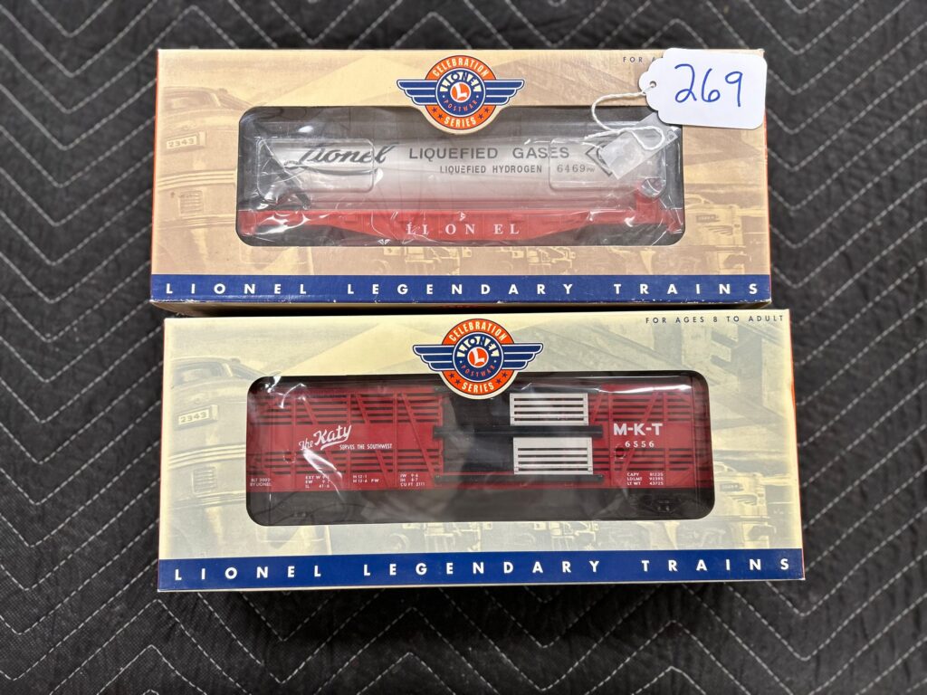 269.     Pair of Lionel O gauge train cars including 6-19449 Liquefied Gas Tank Car, 6-19558 Stock Car MKT P.W. both...