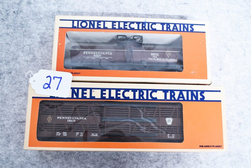 27.       Pair of Lionel O gauge train cars including 6-19510 Penna. Stock car, 6-6307 Penna. Single dome Tank car, both...