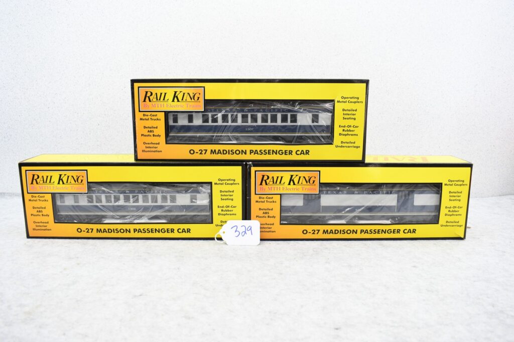 329.     Lot of 3 MTH O gauge train cars including 30-6220 Texas & Pacific Madison Baggage car, 30-6221 Texas &...