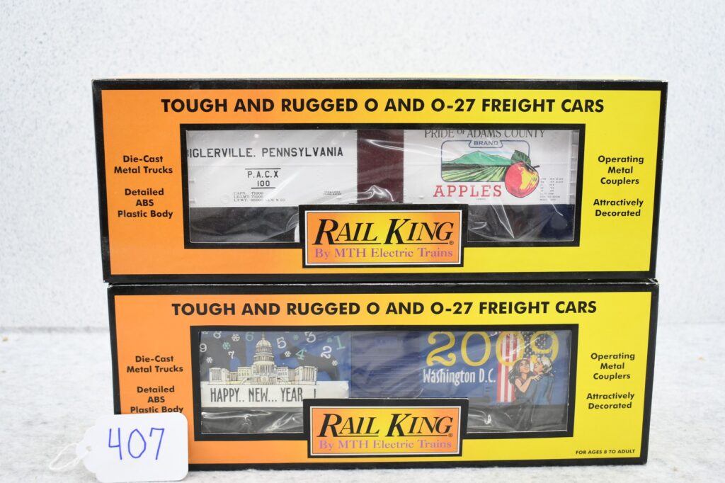 407. Pair of MTH O gauge train cars including 30-78118 Adams County Apples Modern Reefer Car, 30-74499 New Year 2009 boxcar, both are NIB