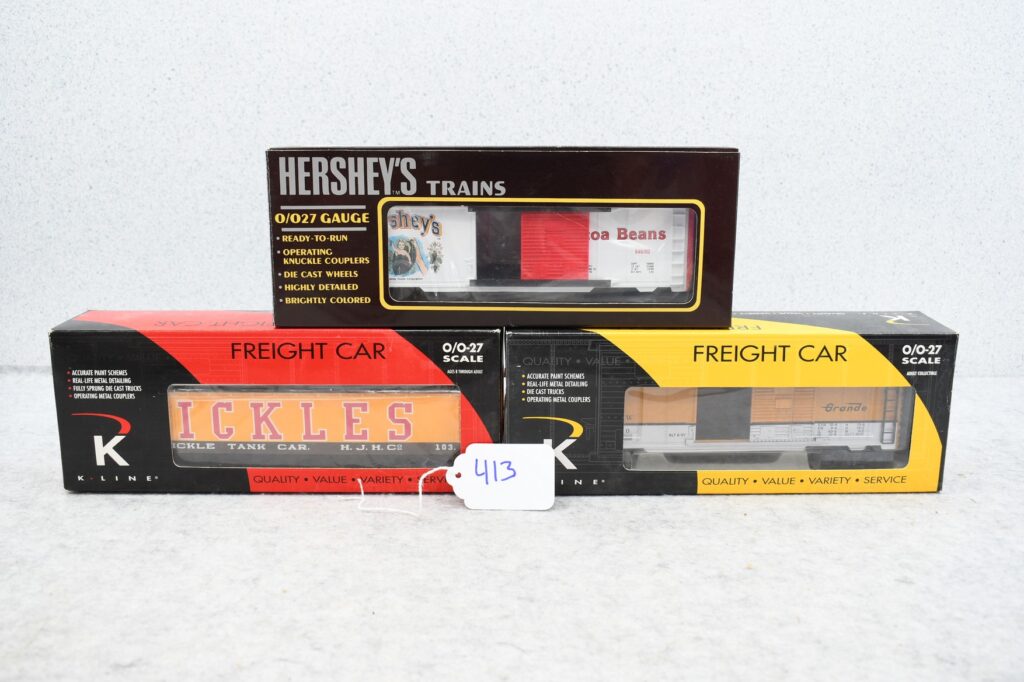 413.     Lot of 3 K-Line O gauge train cars including K641-1494 Rio Grande boxcar, K675-5202 Heinz Closed Sided Vat car,...