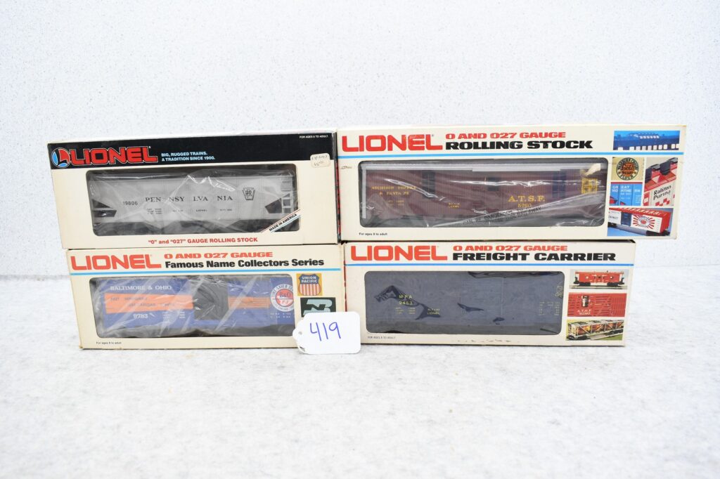 419.     Lot of 4 Lionel O gauge train cars including 6-9453 MPA Railroad boxcar, 6-9783 B&O boxcar, 6-5760 ATSF Tool...