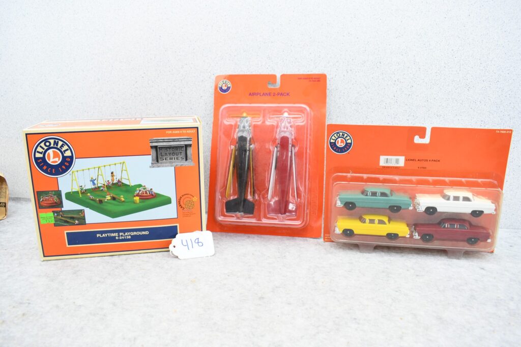 418.     Lot of 3 Lionel items including 6-24138 Playtime Playground, 6-37820 Lionel auto 4 pack, Lionel two pack of airplanes....