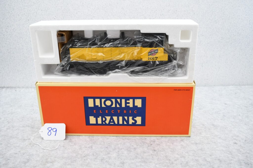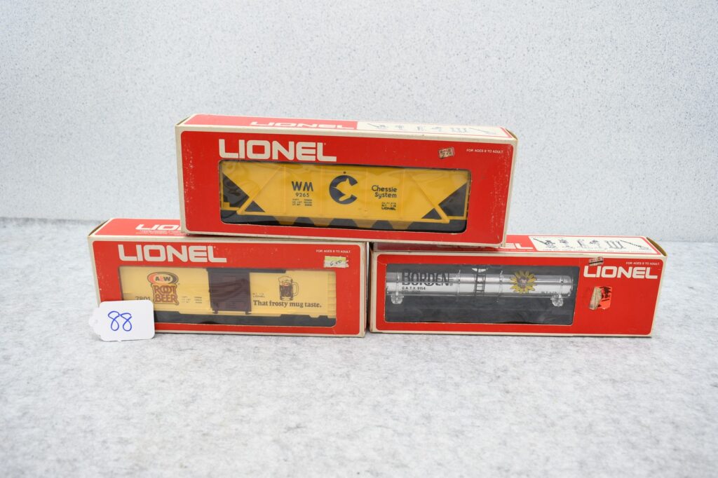 88.       Lot of 3 Lionel O gauge train cars including 6-9154 Borden Plated Tank Car, 6-7801 A&W box car, 6-9265...