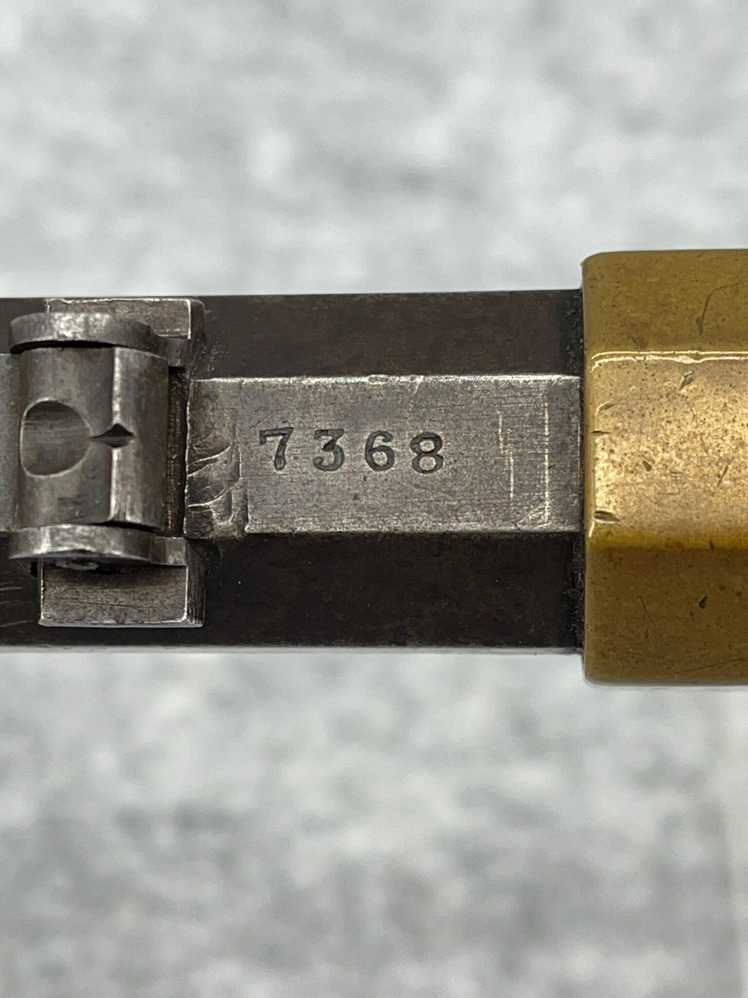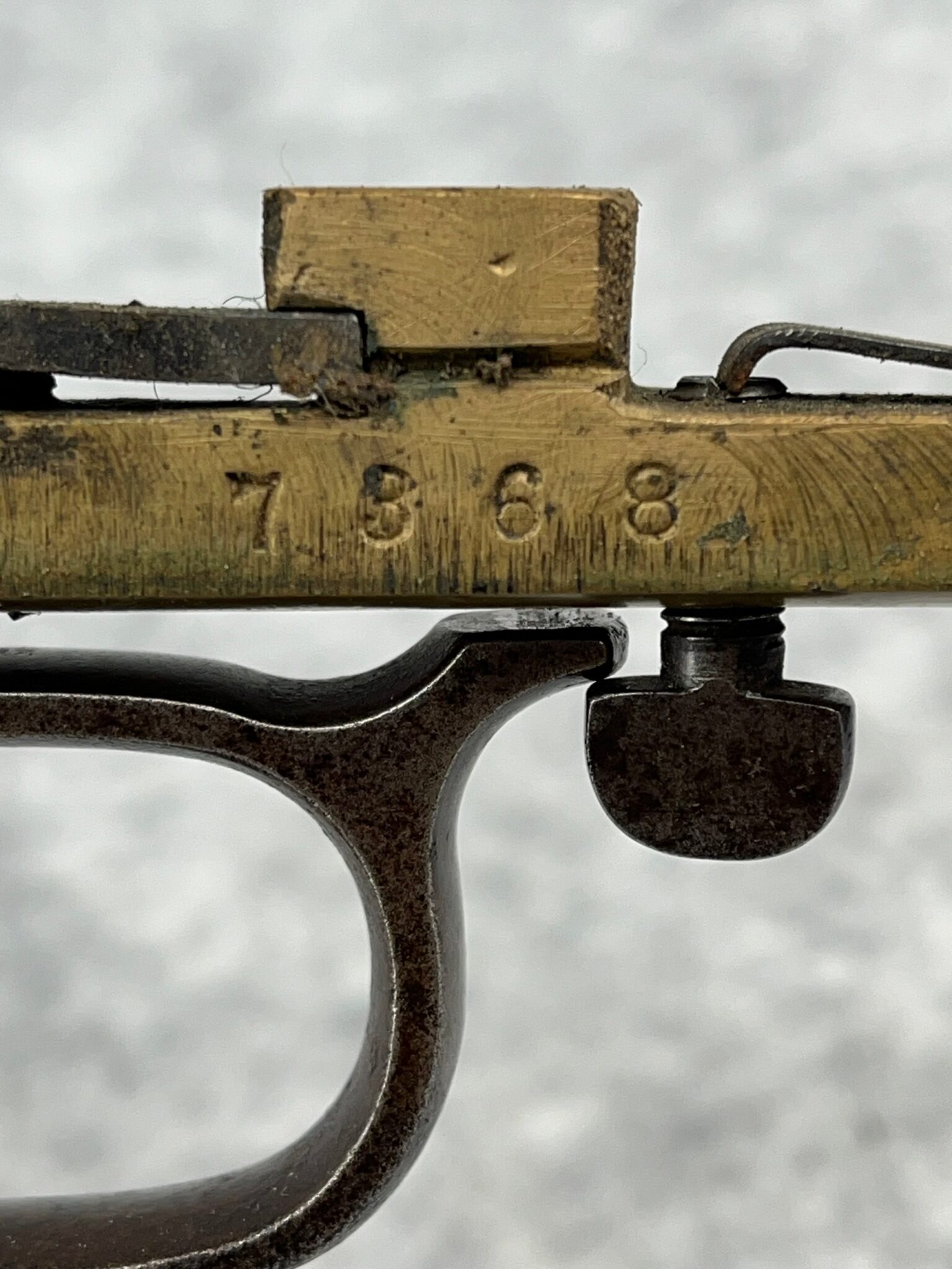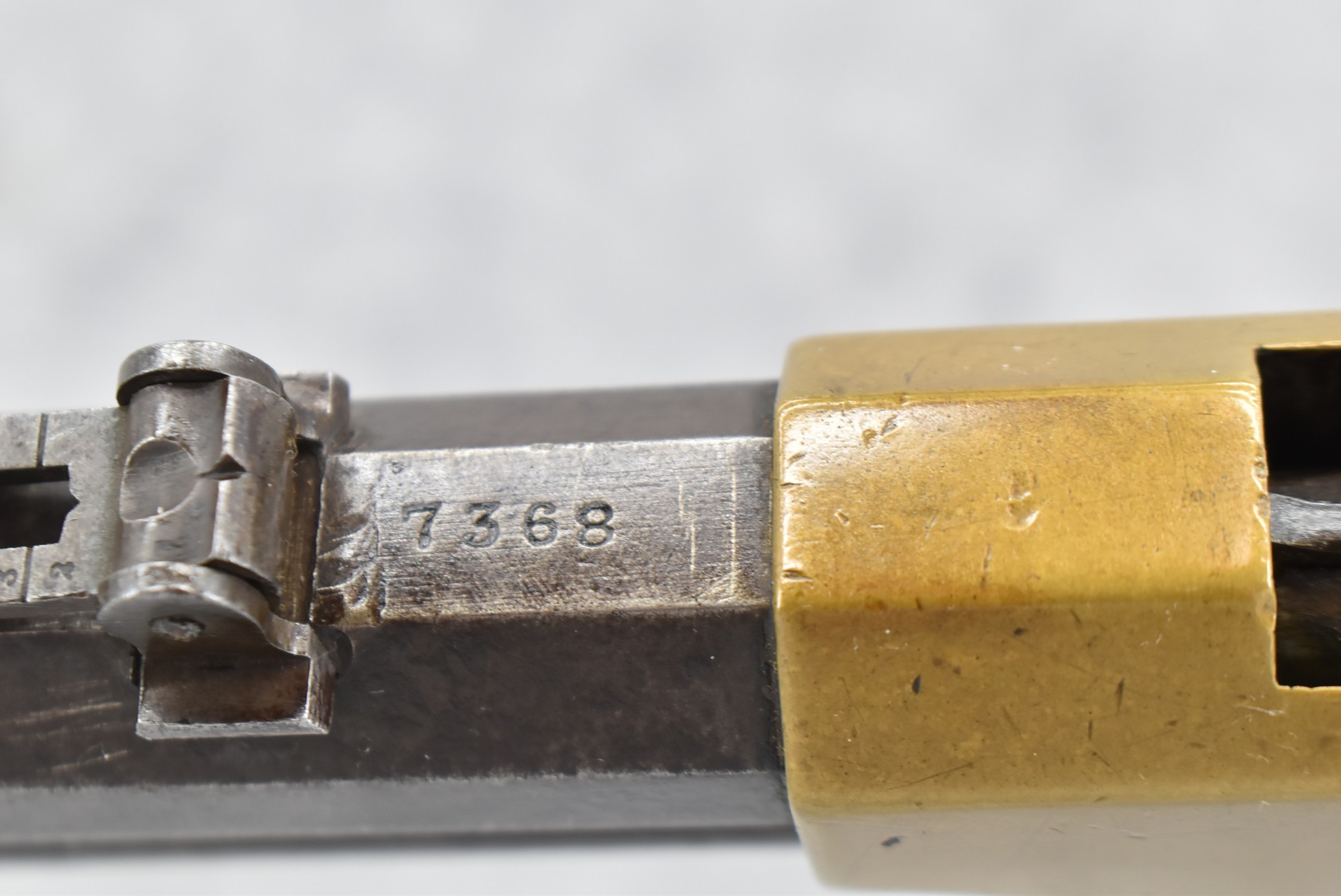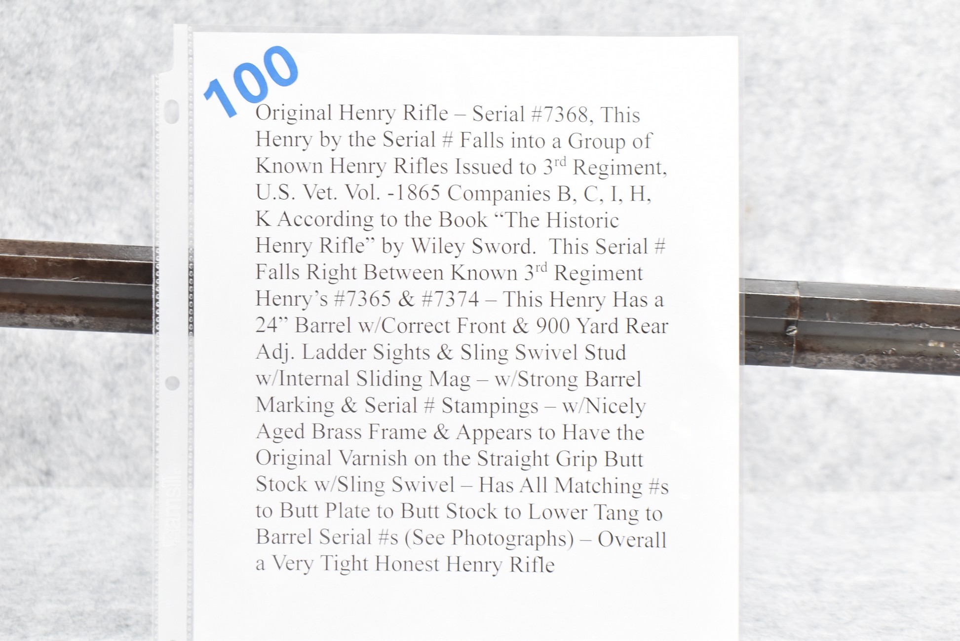 100. Original Henry Rifle – Serial #7368, This Henry by the Serial # Falls into a Group of Known Henry Rifles Issued to 3rd Regiment, U.S. Vet. Vol. -1865 Companies B, C, I, H, K According to the Book “The Historic Henry Rifle” by Wiley Sword. This Serial # Falls Right Between Known 3rd Regiment Henry’s #7365 & #7374 – This Henry Has a 24” Barrel w/Correct Front & 900 Yard Rear Adj. Ladder Sights & Sling Swivel Stud w/Internal Sliding Mag – w/Strong Barrel Marking & Serial # Stampings – w/Nicely Aged Brass Frame & Appears to Have the Original Varnish on the Straight Grip Butt Stock w/Sling Swivel – Has All Matching #s to Butt Plate to Butt Stock to Lower Tang to Barrel Serial #s (See Photographs) – Overall a Very Tight Honest Henry Rifle