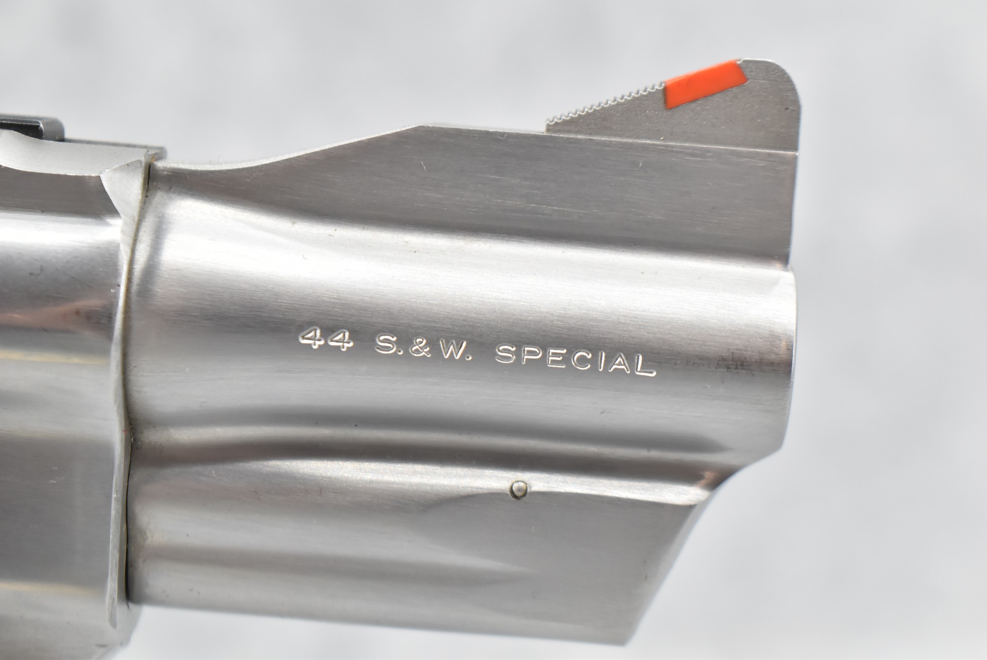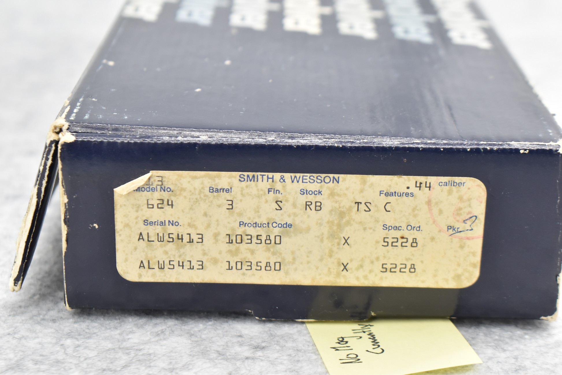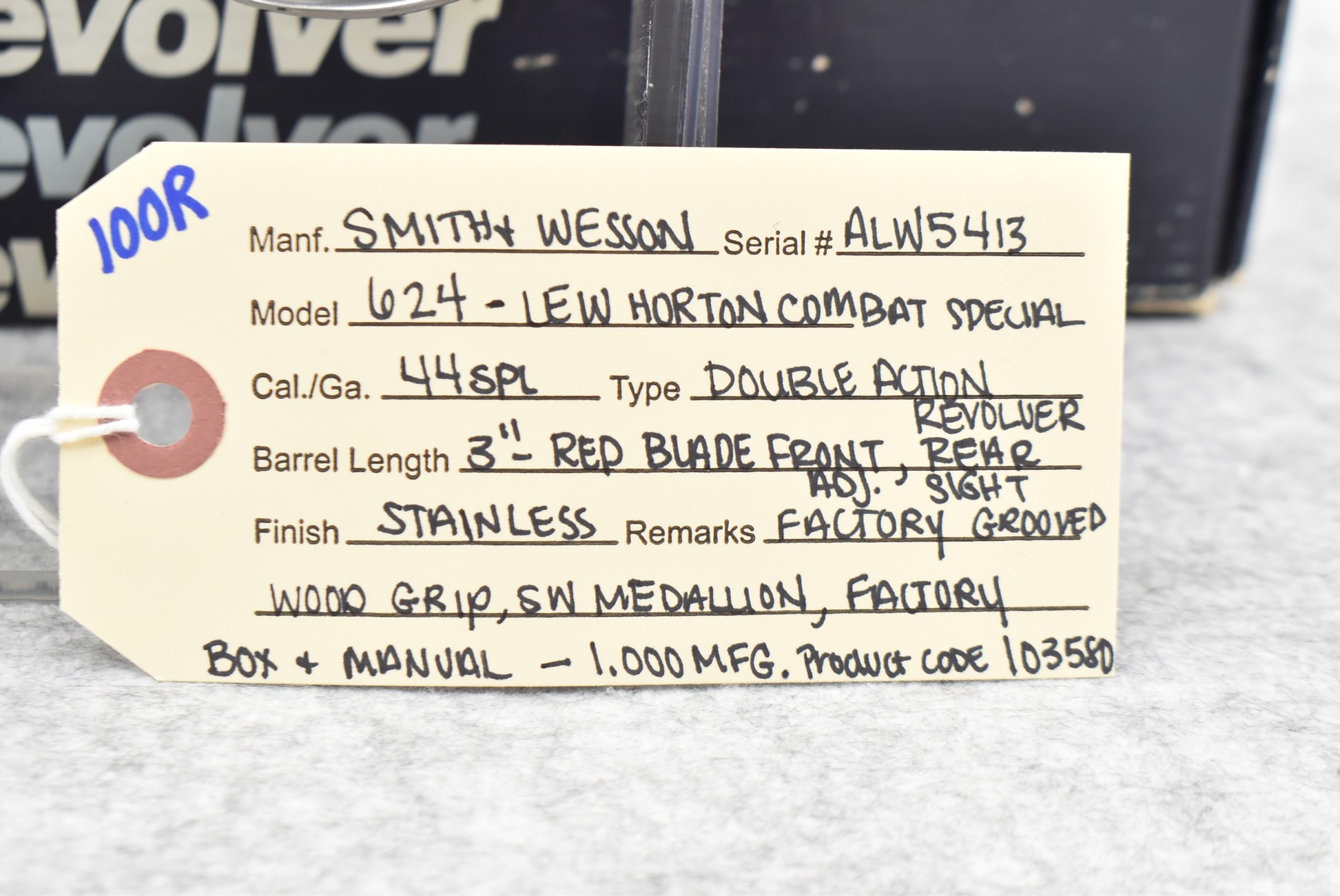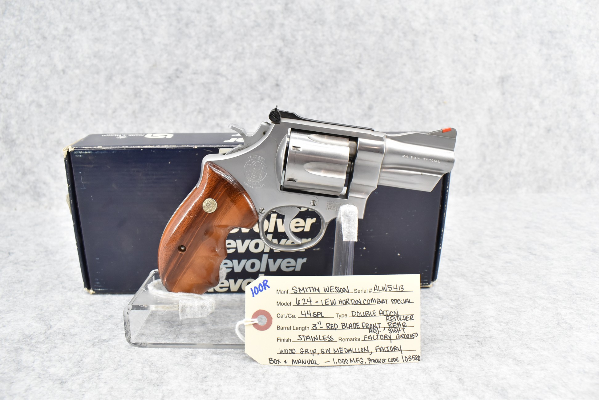 100R. Smith & Wesson – Mod. 624 Lew Horton Combat Special – 44 Spl. Cal. Double Action Revolver – w/3” Barrel w/Red Blade Front and Adjustable Rear Sights – Stainless Finish – w/Factory Grooved Wood Grip w/Smith & Wesson Medallion – 1,000 Manufactured – Product Code 103580 – w/Factory Box and Manual