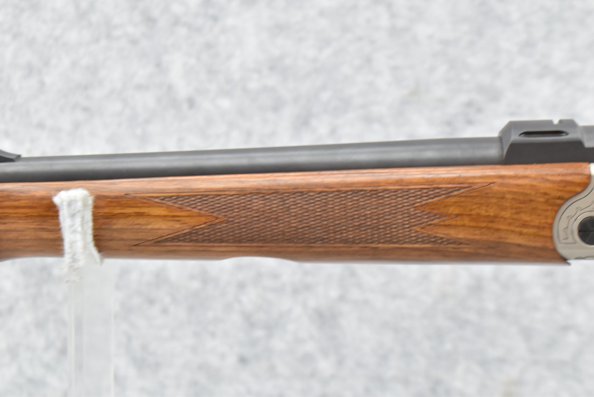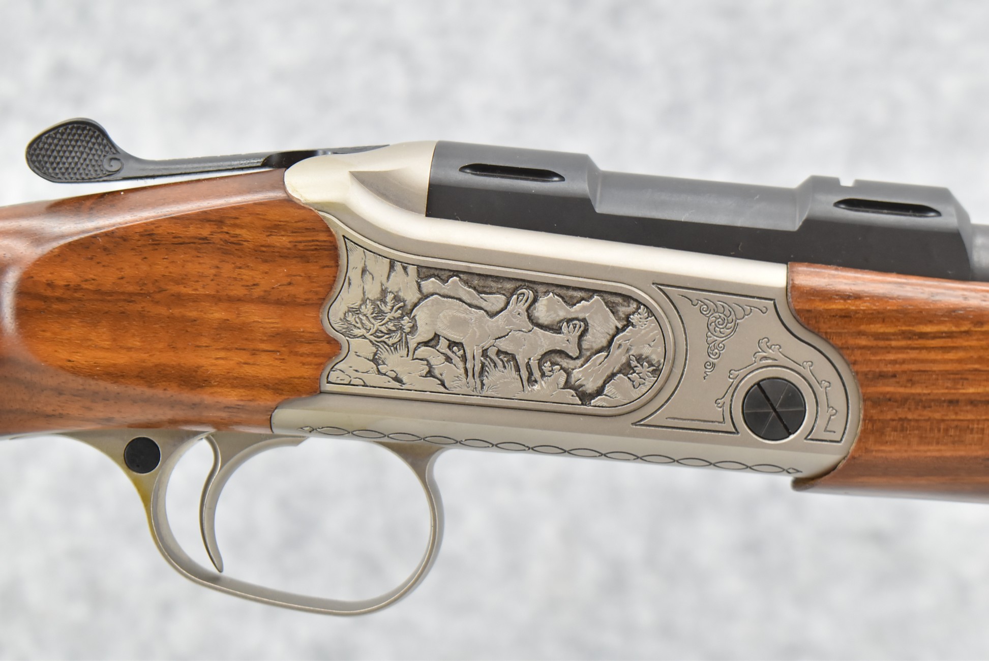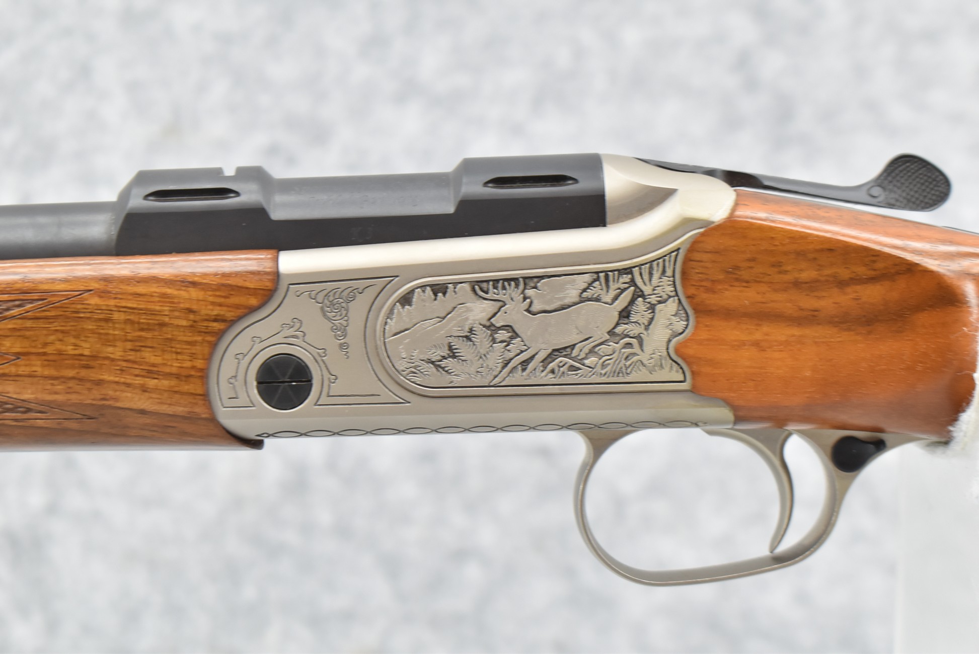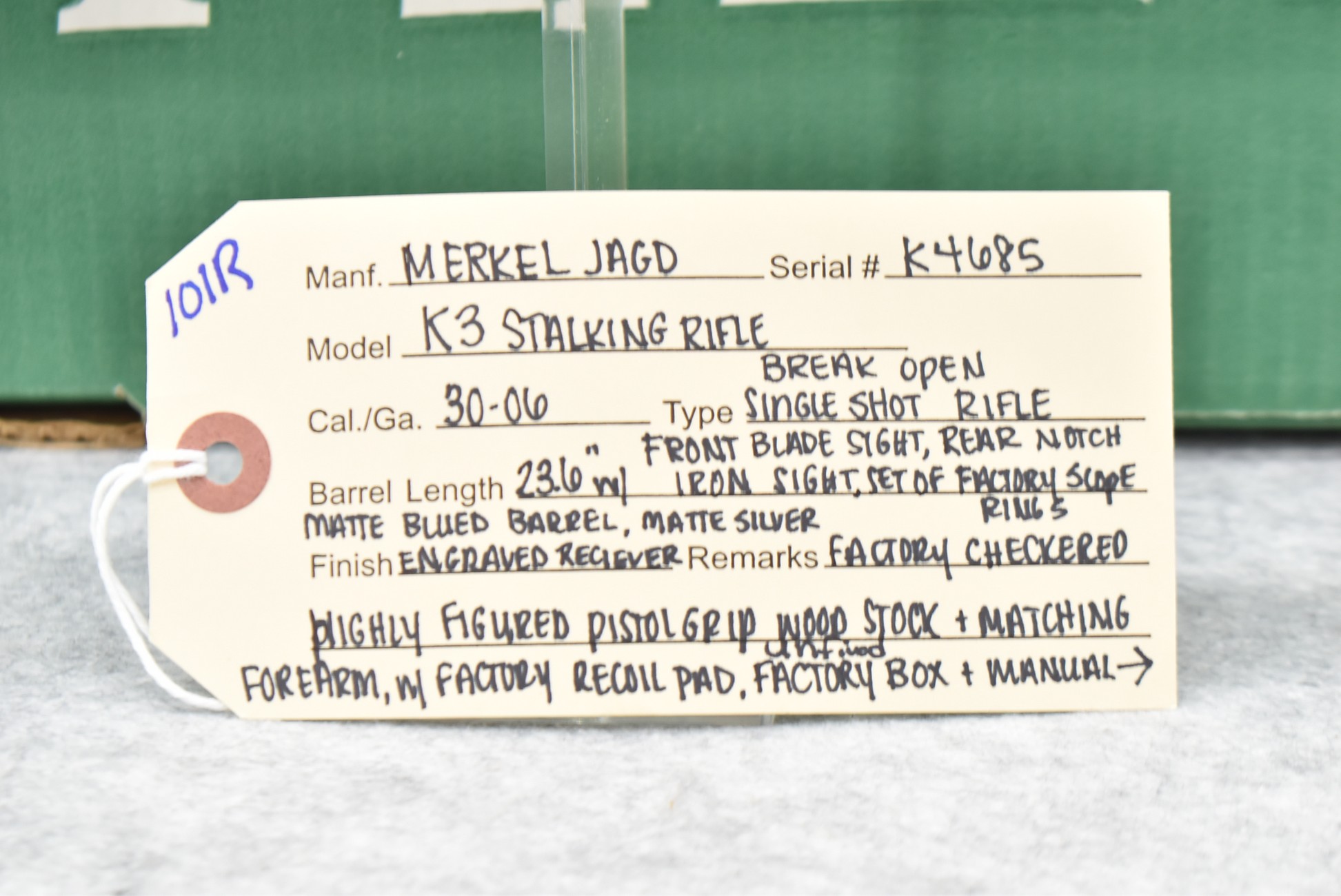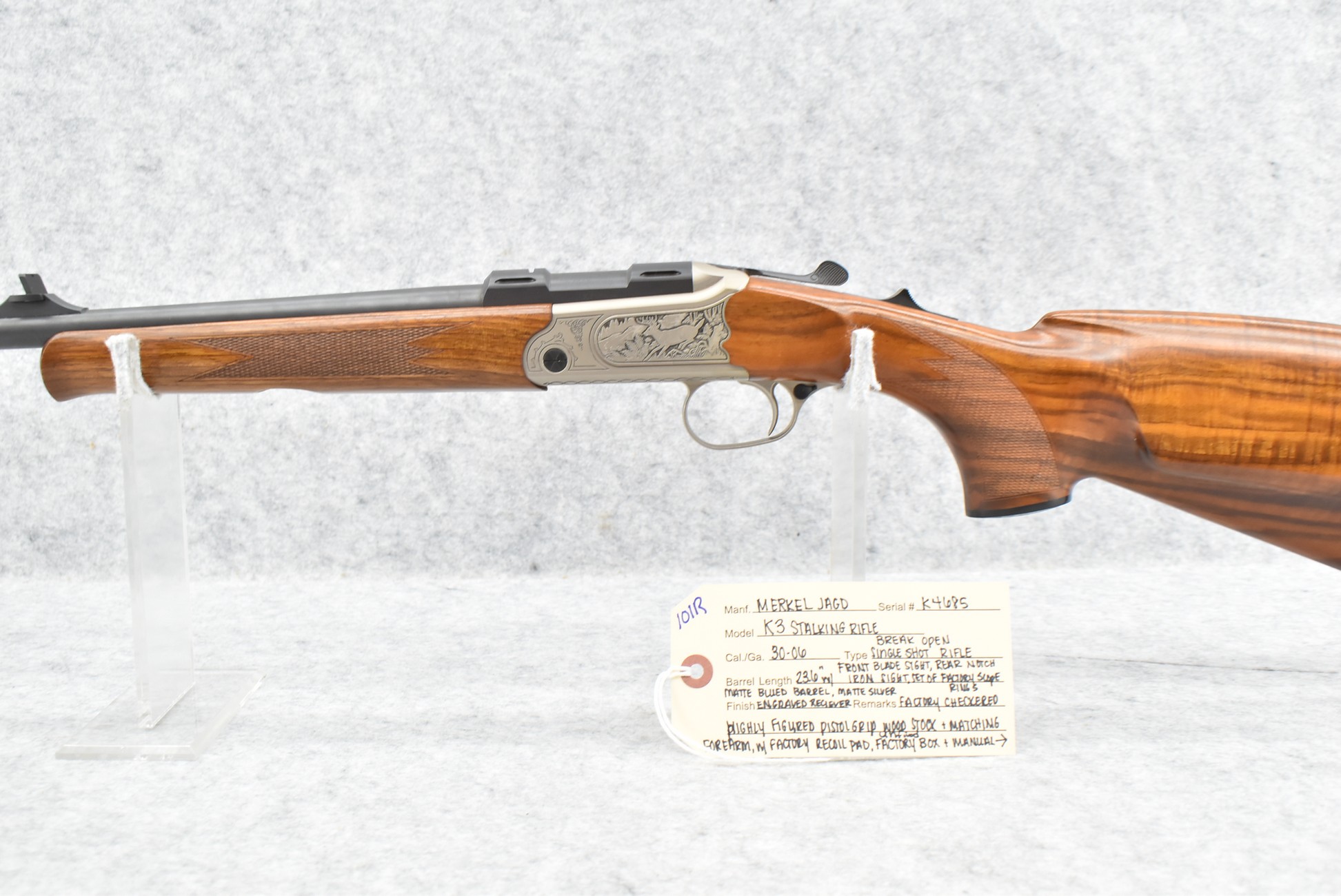101R. Merkel Jagd – Mod. K3 Stalking Rifle – 30-06 Cal. Break-Open Single Shot Rifle – w/23.6” Matte Blued Finish Barrel w/Front Blade & Rear Notch Irons Sights – w/Matte Silver Finish Game Scene Engraved Receiver – w/Factory Checkered Highly Figured Pistol Grip Wood Stocks w/Factory Recoil Pad – w/Factory Scope Mounts & Rings – Unfired w/Factory Box & Manual
