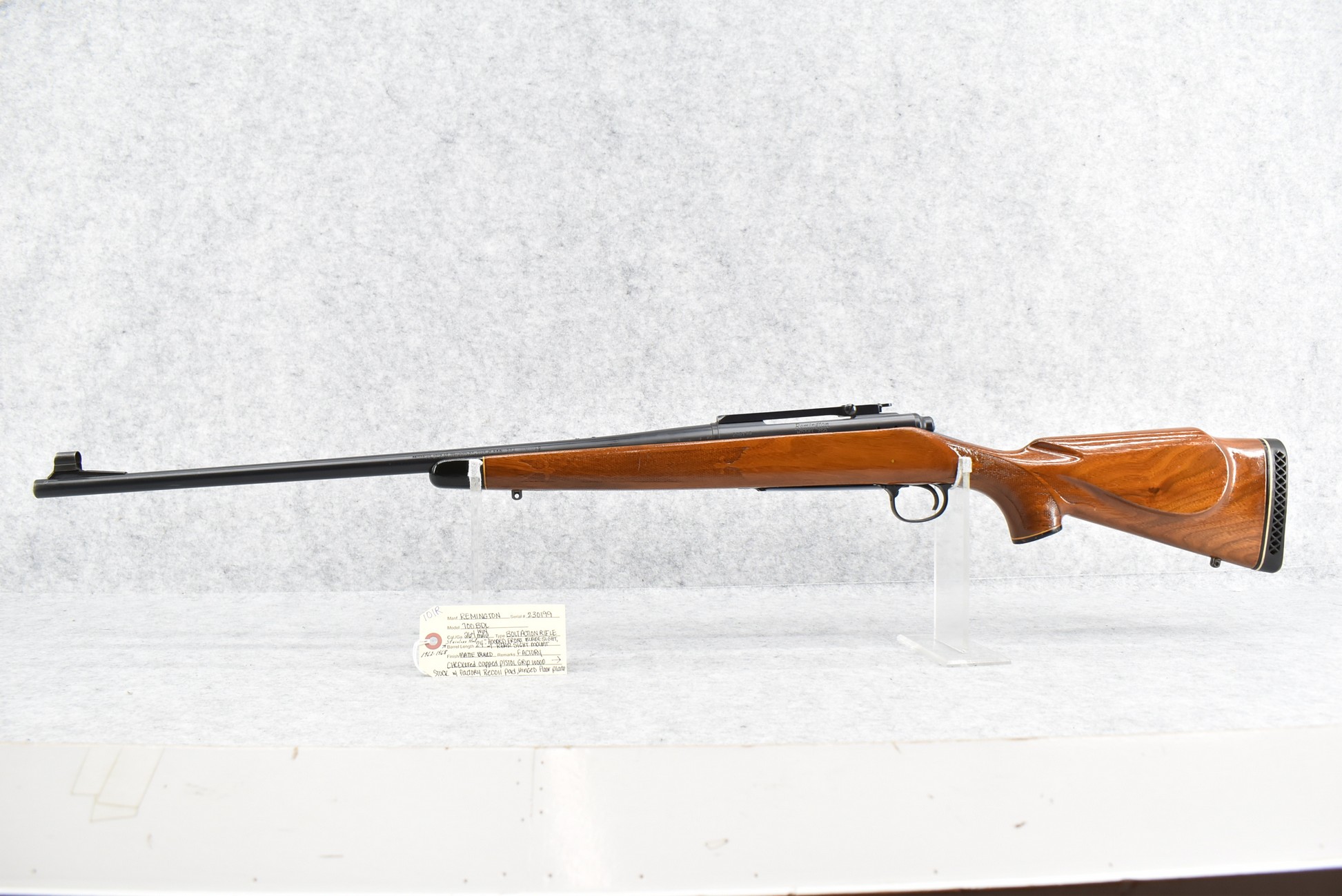 101R. Remington – Mod. 700 BDL – 264 Win. Mag. Cal. Bolt Action Rifle – w/24” Stainless Steel Barrel w/Hooded Front Blade Sight & Rear Sight Mount – Matte Blued Finish – w/Factory Checkered Capped Pistol Grip Wood Stock w/Factory Recoil Pad – w/Hinged Floor Plate – Note: Stainless Steel Barrel Mfg. Between 1962-1968 Only