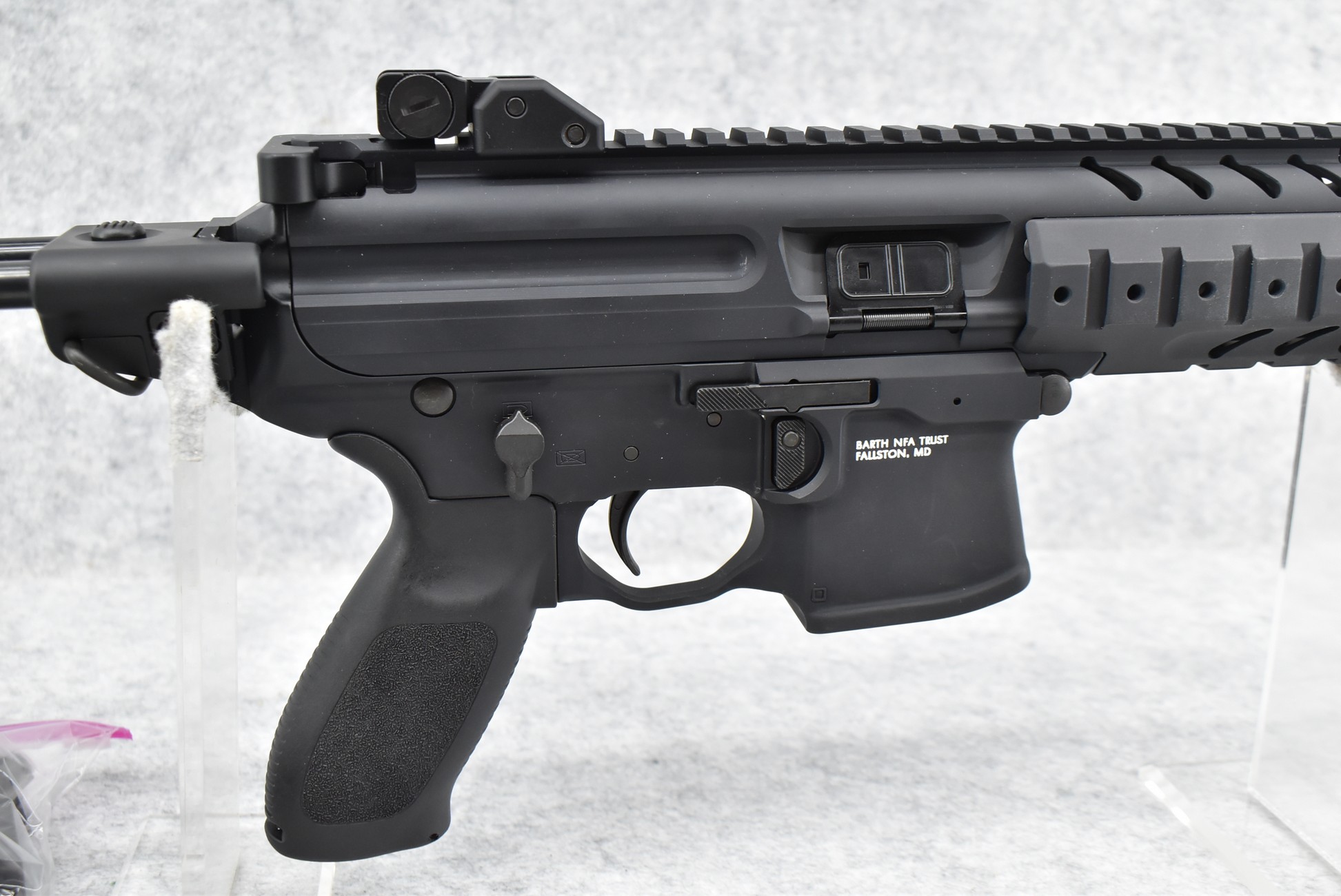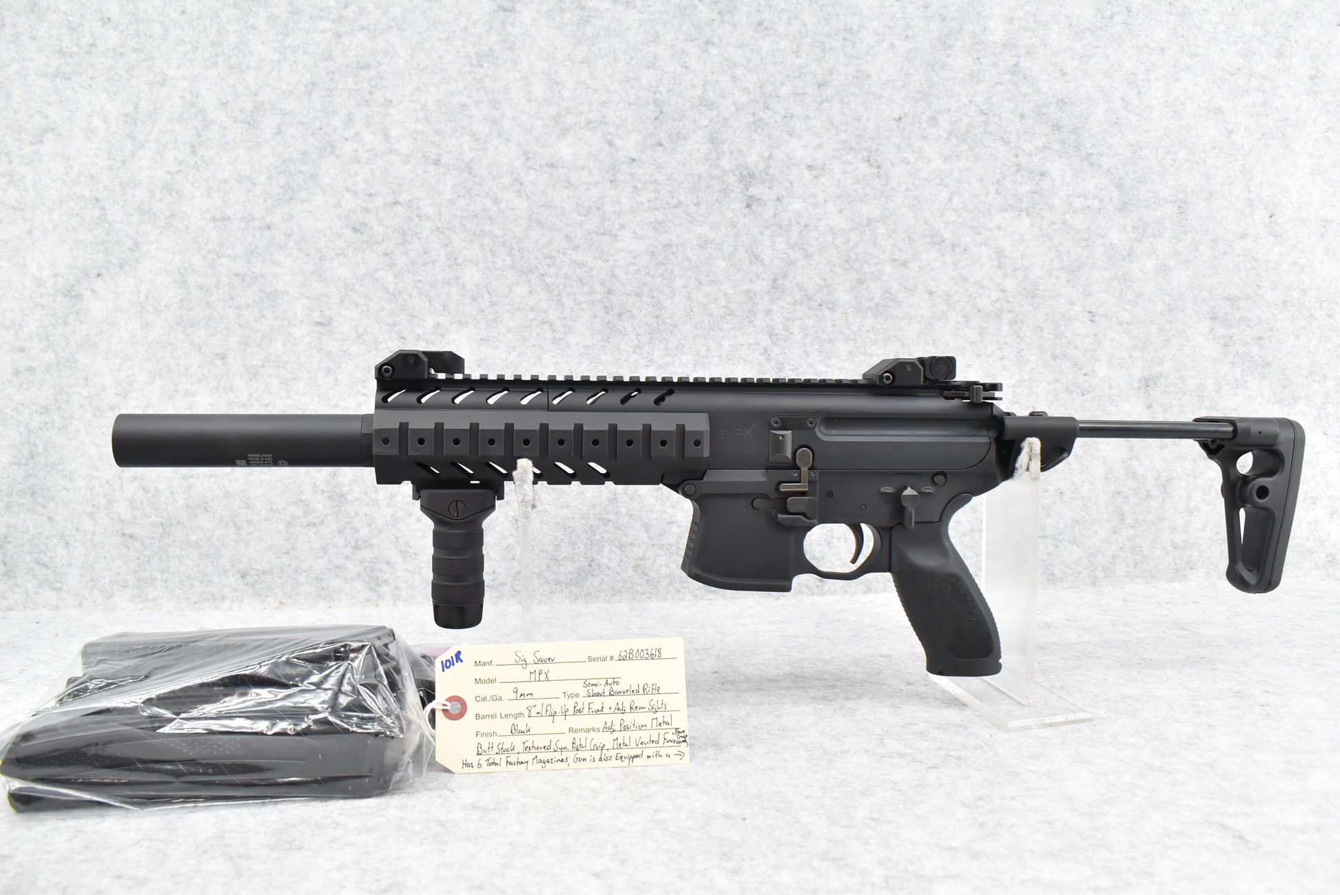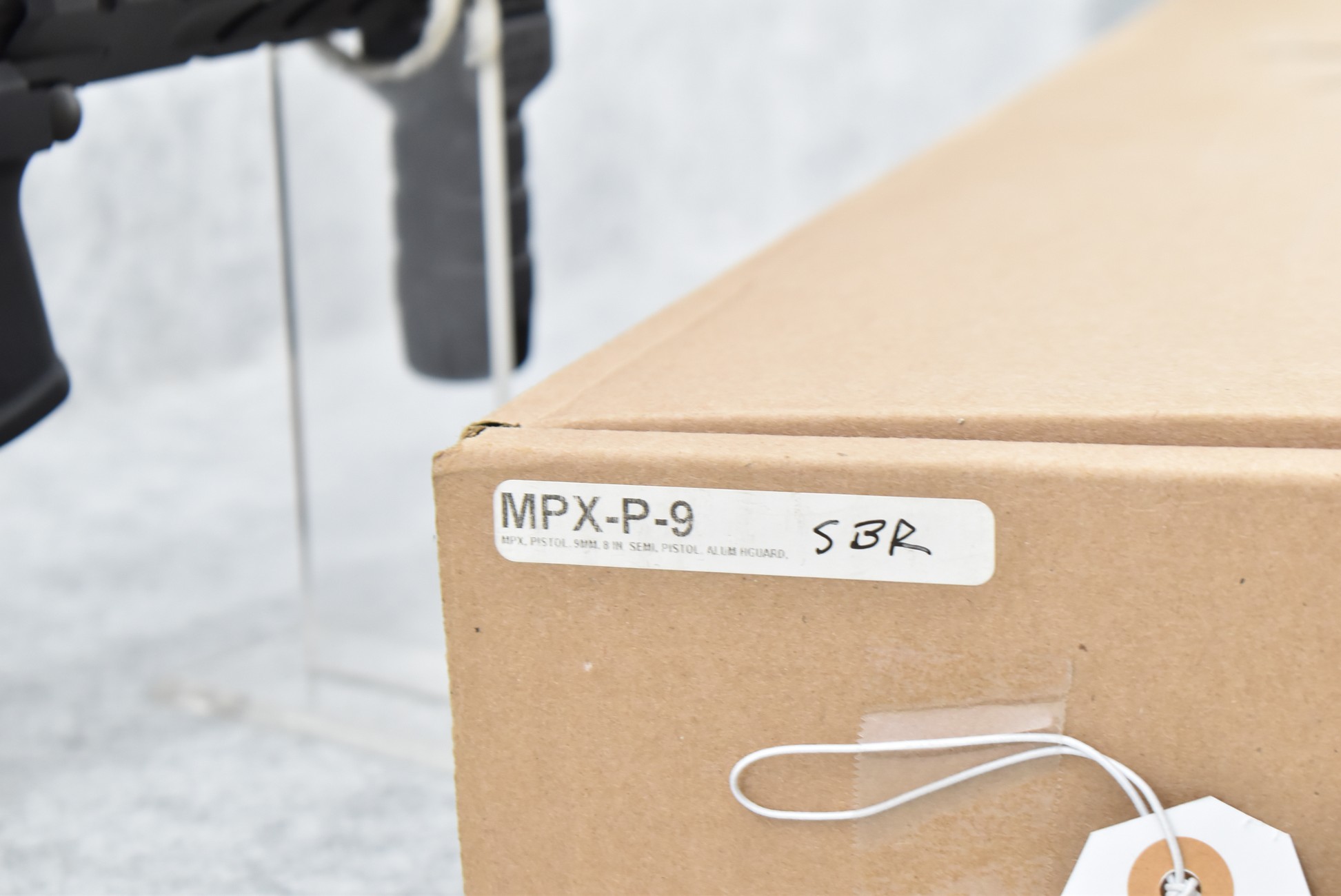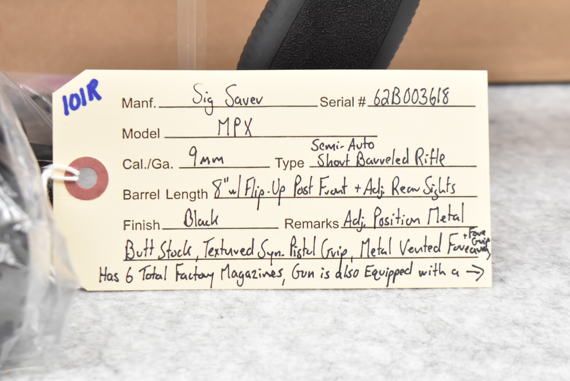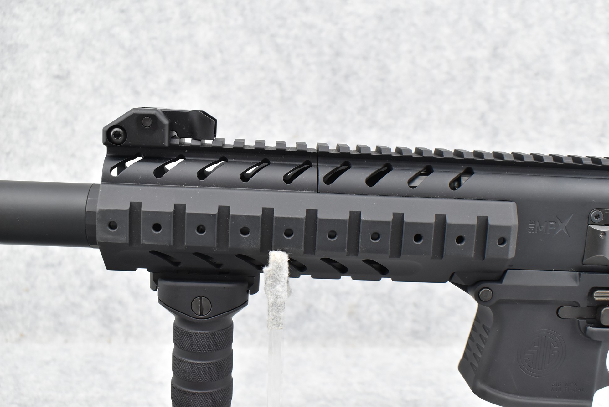 101R. Sig Sauer – Mod. MPX – 9mm Cal. Semi-Auto Short Barreled Rifle (SBR) – w/8” Barrel w/Flip-Up Post Front & Adj. Rear Sights – Matte Black Finish – w/Adj. Position Metal Butt Stock, Textured Synthetic Pistol Grip, Metal Vented Forearm & Fore Grip Pistol Grip – w/6 Total Factory Magazines – w/Flat Top Picatinny Rail – Gun is Also Equipped with a GEMTECH GM-9 Suppressor – w/Gun Factory Box & Manual – Gun and Silencer are both on Separate RAS Inc. NFA Book E-File Form 3 & Form 4 – Both Fully Transferable & Selling Together Please Check Your State & Local Laws For Legality Before Attempting to Purchase This Firearm!