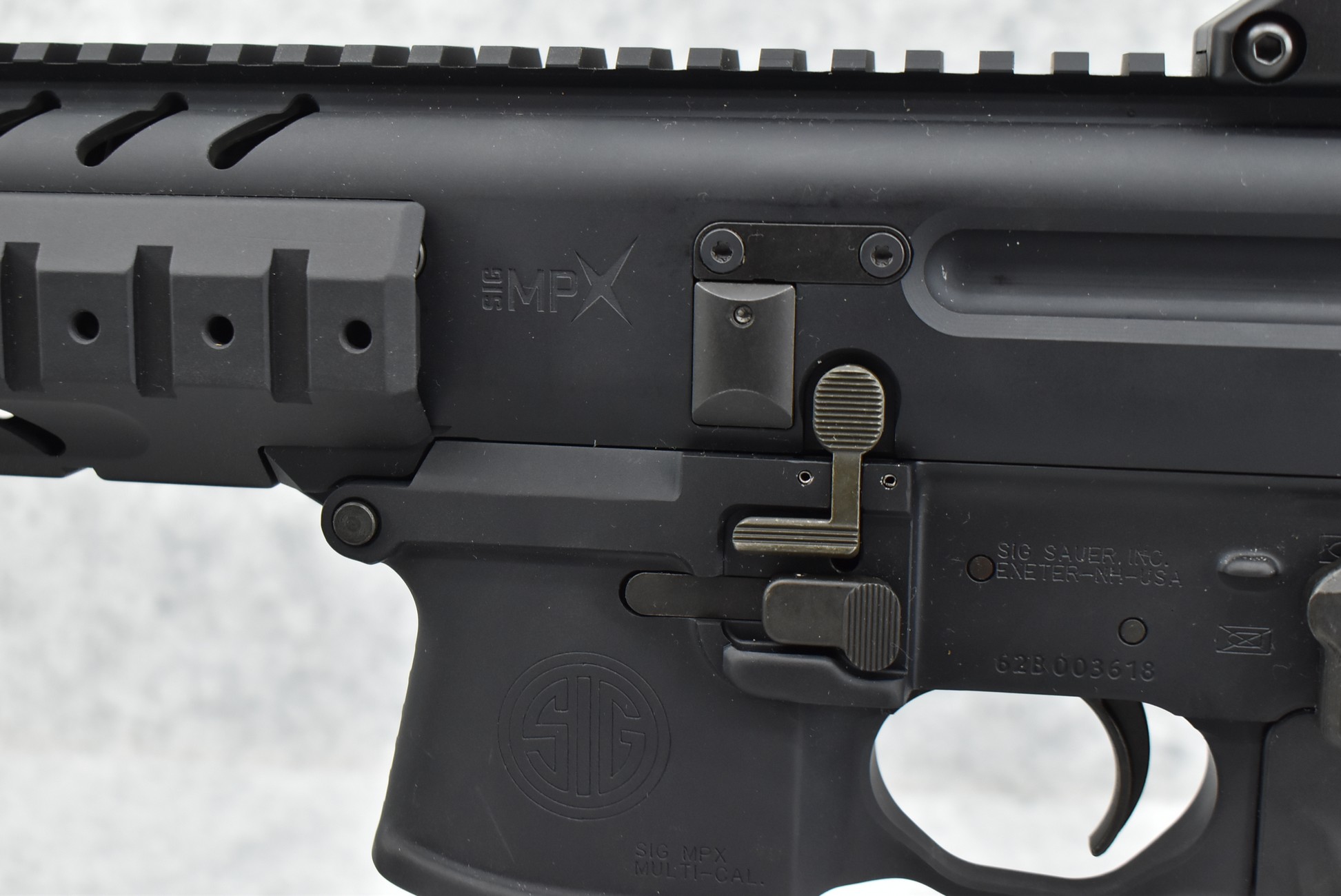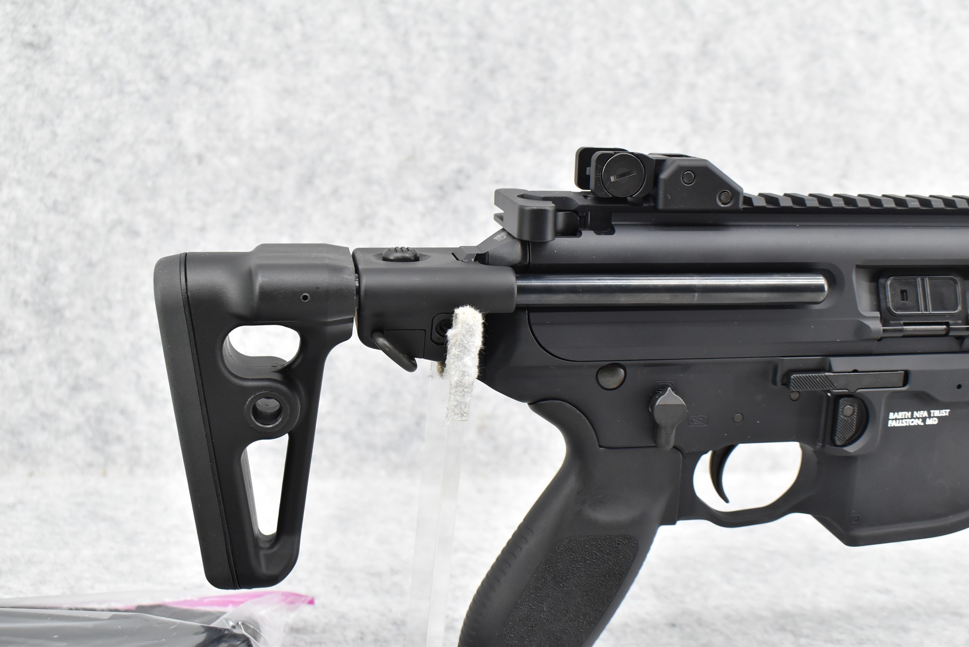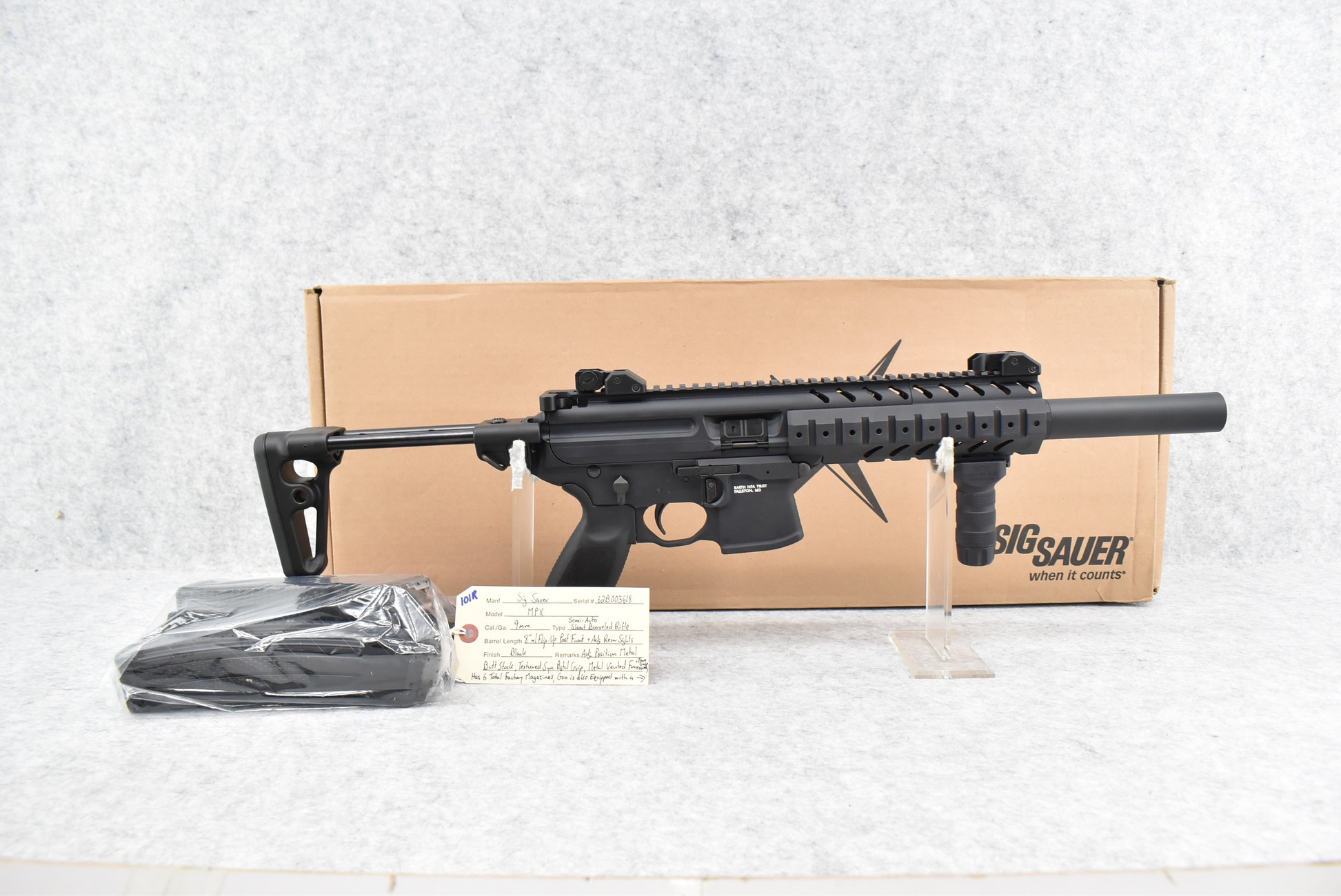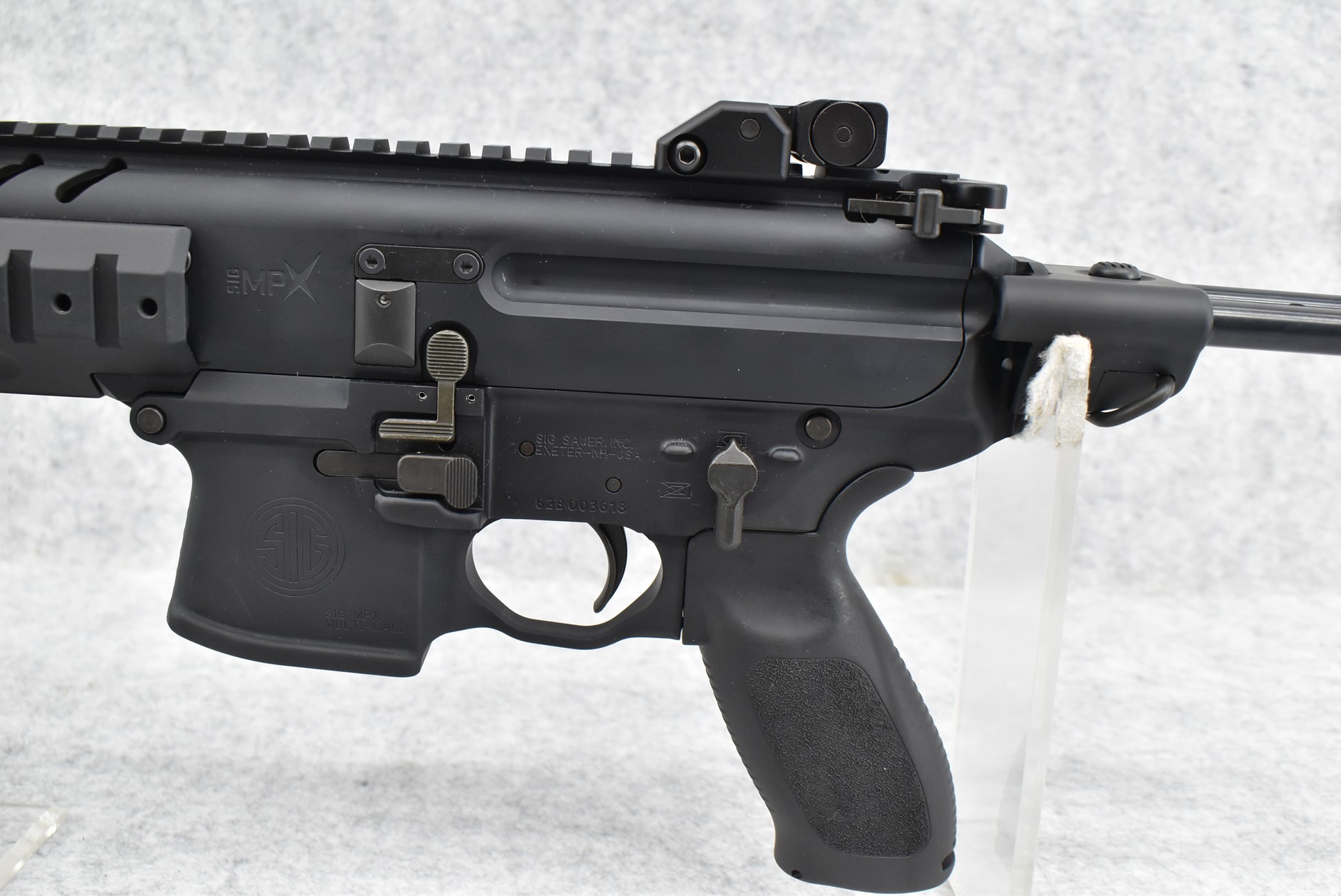 101R. Sig Sauer – Mod. MPX – 9mm Cal. Semi-Auto Short Barreled Rifle (SBR) – w/8” Barrel w/Flip-Up Post Front & Adj. Rear Sights – Matte Black Finish – w/Adj. Position Metal Butt Stock, Textured Synthetic Pistol Grip, Metal Vented Forearm & Fore Grip Pistol Grip – w/6 Total Factory Magazines – w/Flat Top Picatinny Rail – Gun is Also Equipped with a GEMTECH GM-9 Suppressor – w/Gun Factory Box & Manual – Gun and Silencer are both on Separate RAS Inc. NFA Book E-File Form 3 & Form 4 – Both Fully Transferable & Selling Together Please Check Your State & Local Laws For Legality Before Attempting to Purchase This Firearm!